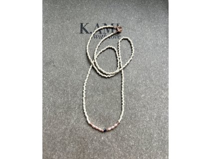 Krátký řetízek z japonských rokajlů s fazetami zlacenými růžovým zlatem (Ag925), růžovými říčními perličkami a kamínkem, zlacené zapínání (Ag925). Obvod řetízku cca 42,5 cm.