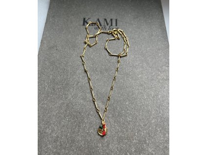 Zlacený řetízek se zlaceným andělíčkem (Ag925), turmalínem a hedvábnou šňůrkou se zlacenou fazetou (Ag925), zlacené zapínání (Ag925). Obvod řetízku cca 45 cm.