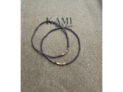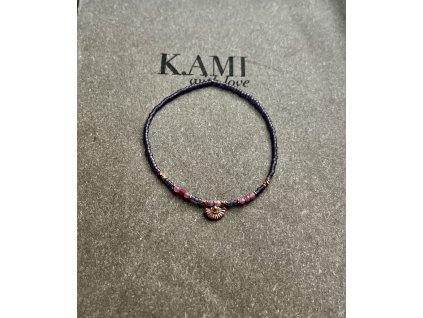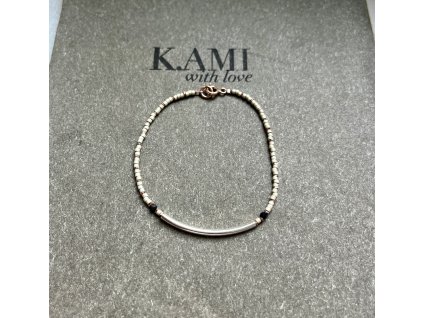 Náramek z japonských rokajlů se stříbrnou trubičkou, fazetami zlacenými růžovým zlatem (Ag925) a safíry, zlacené zapínání. Obvod náramku 17 cm.
