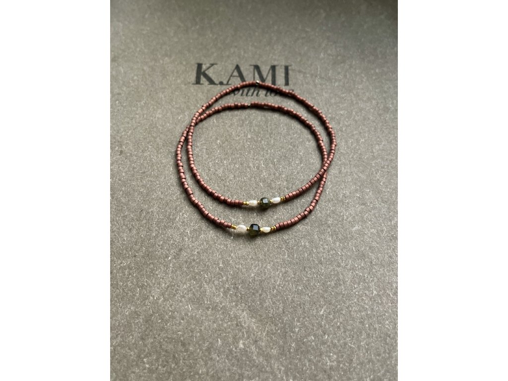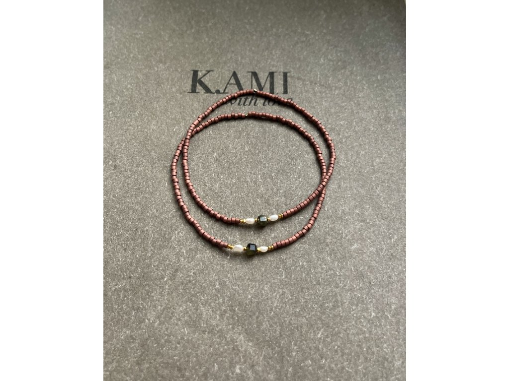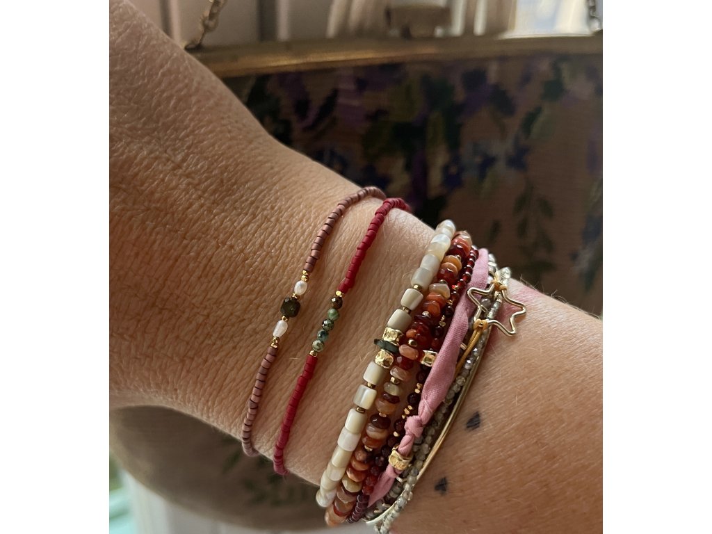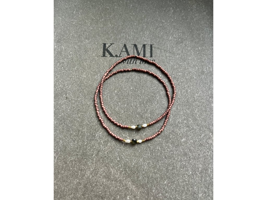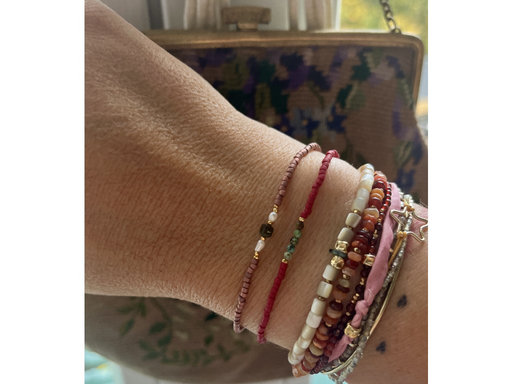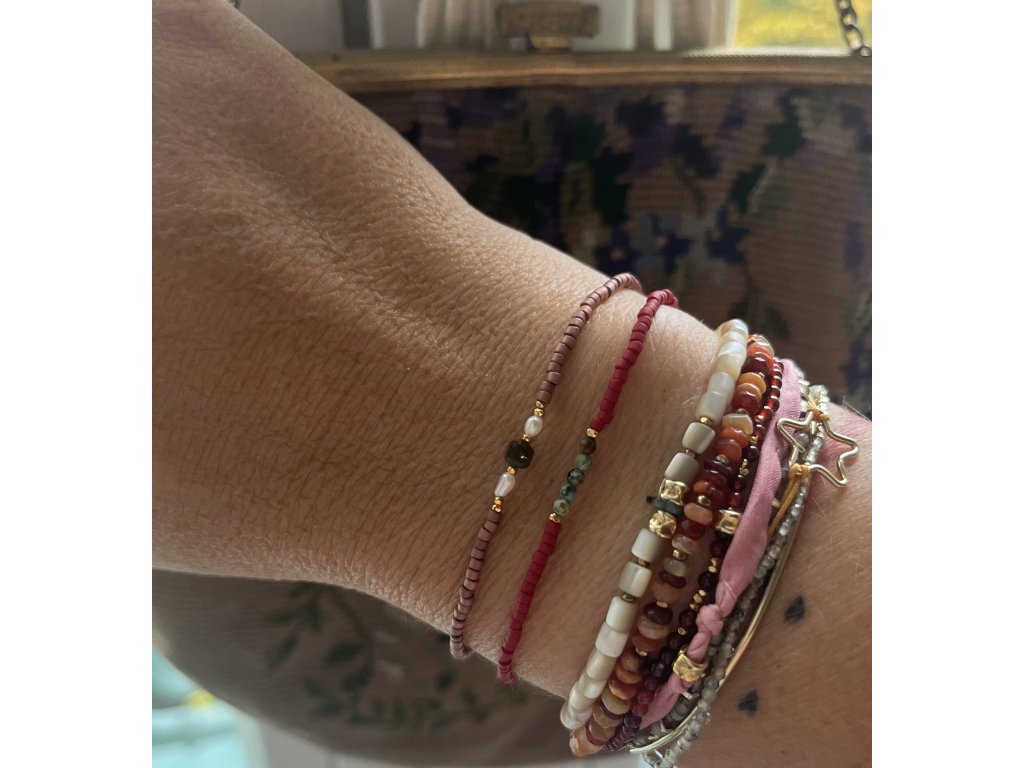 Náramek z japonských rokajlů s perličkami, zlacenými fazetami (Ag925) a hranatými zelenými turmalíny, pružný návlek.