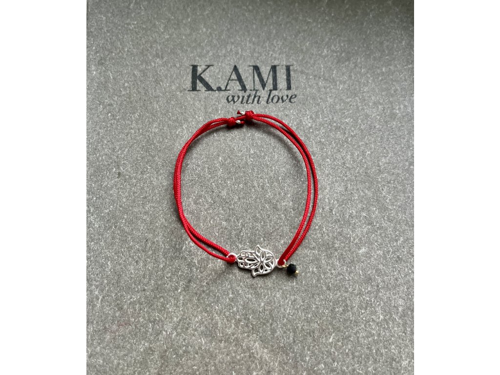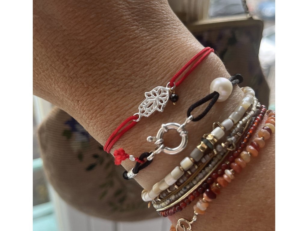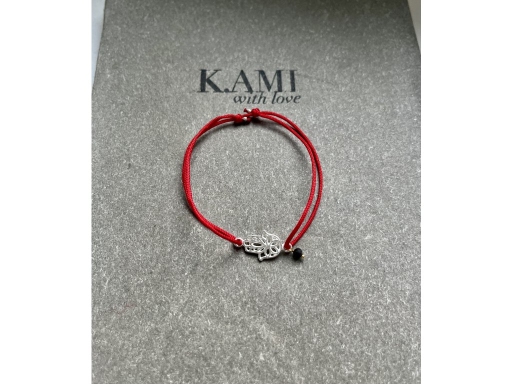 Náramek se stříbrným filigránem na červené šňůrce s kamínkem (turmalín), posuvný úvaz (Ag925).