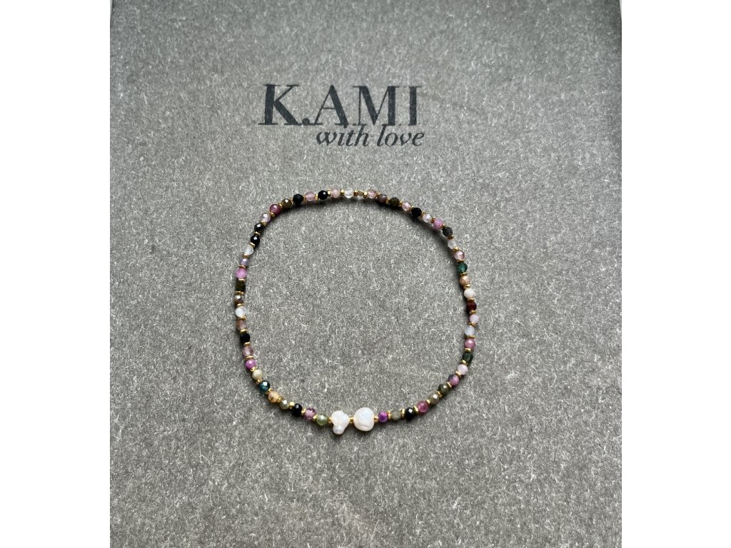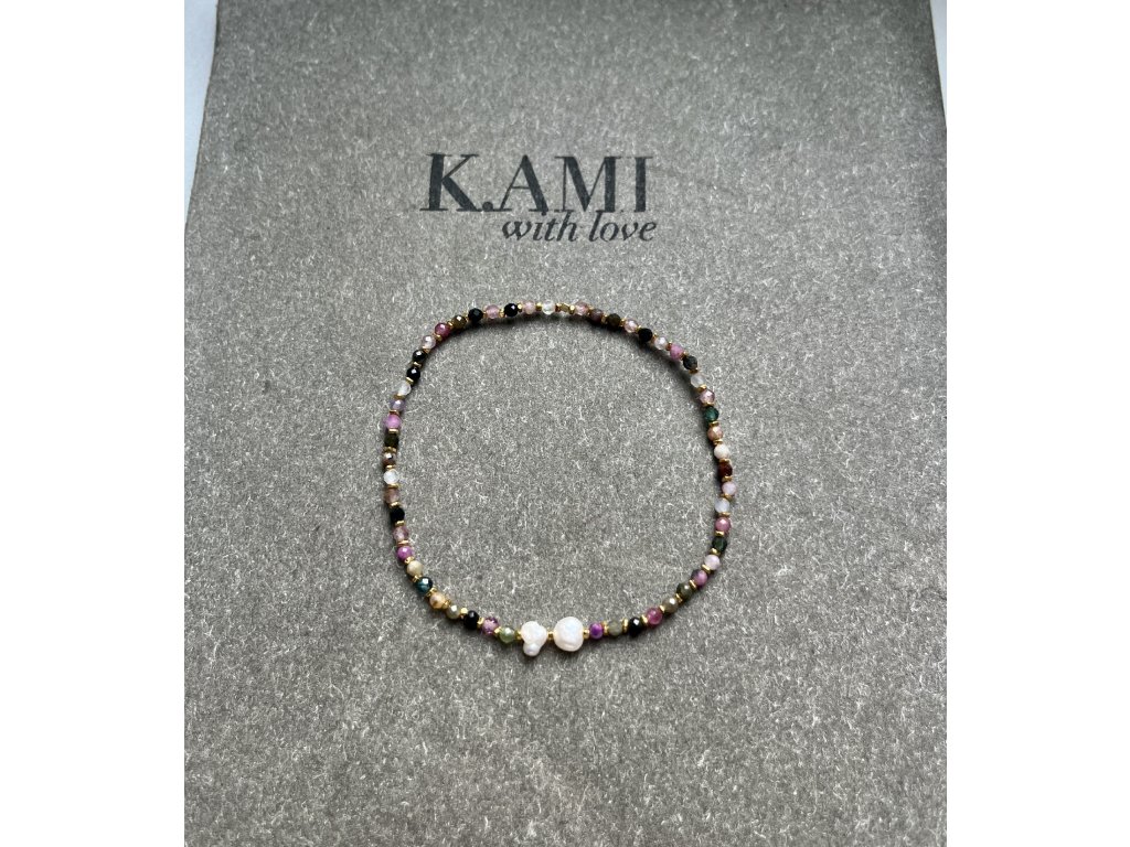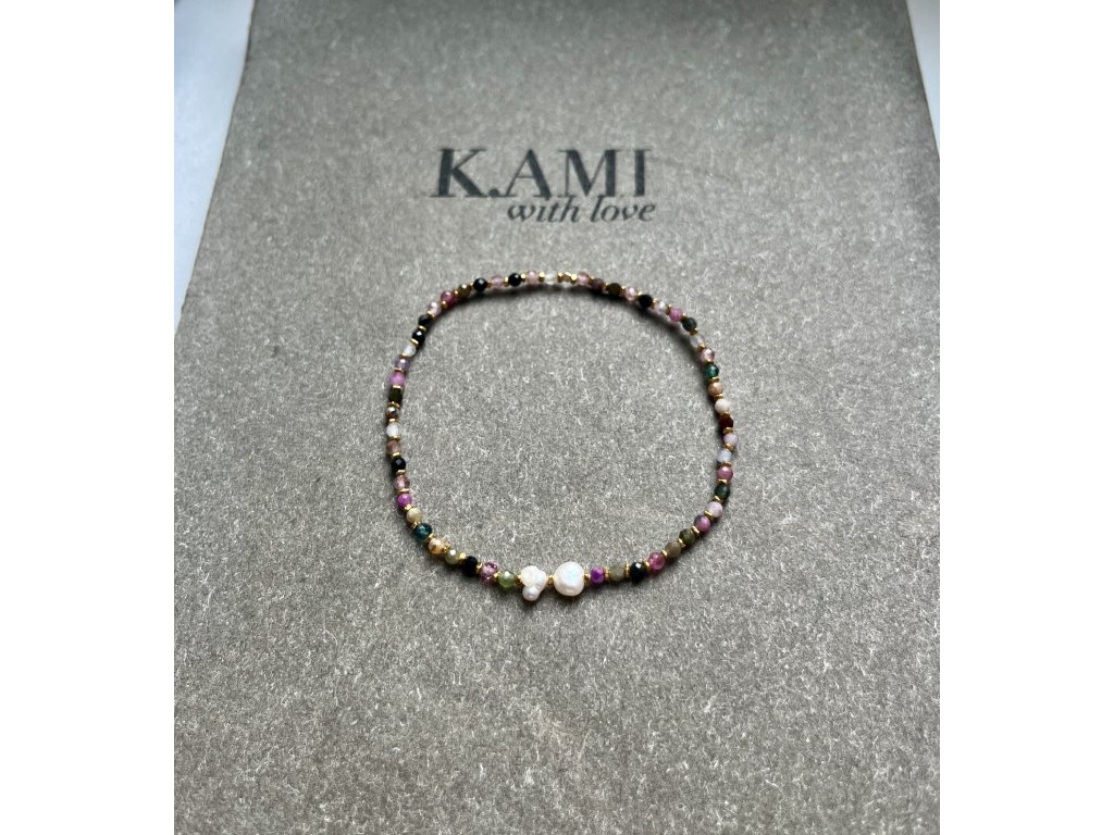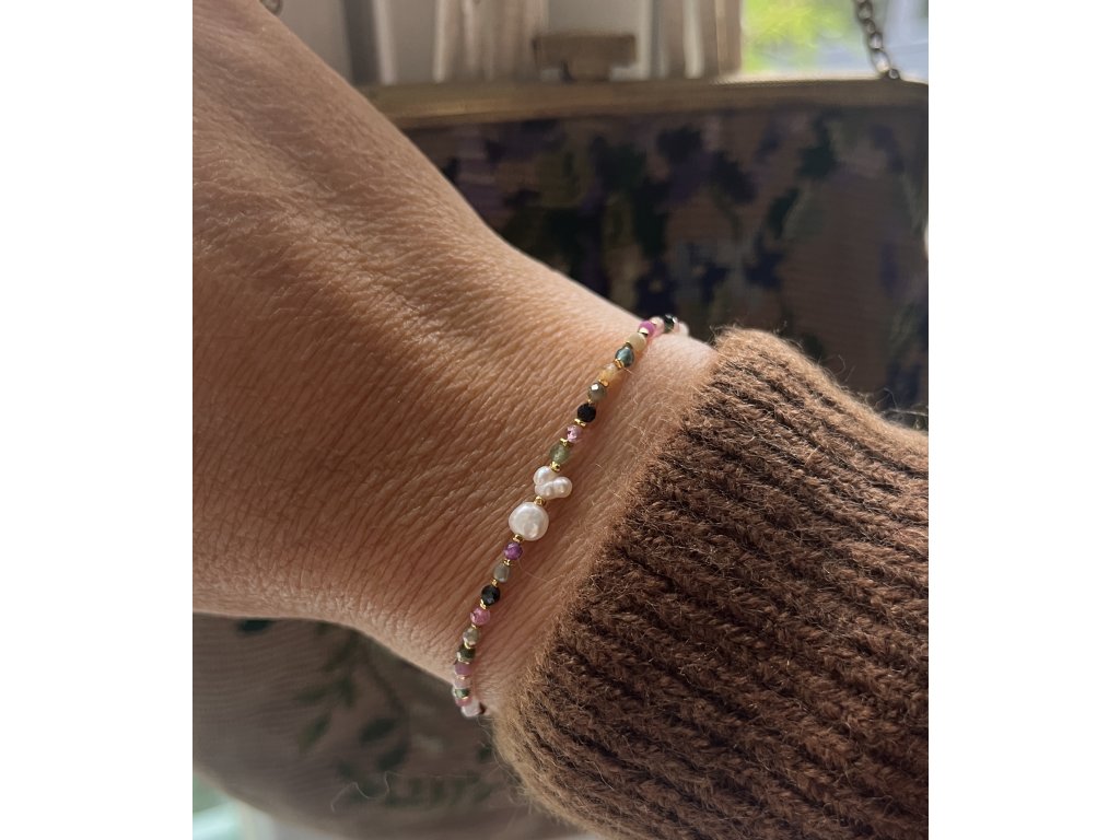 Velmi elegantní náramek z barevných turmalínů a zlacených fazet (Ag925) s říčními perličkami, pružný návlek.