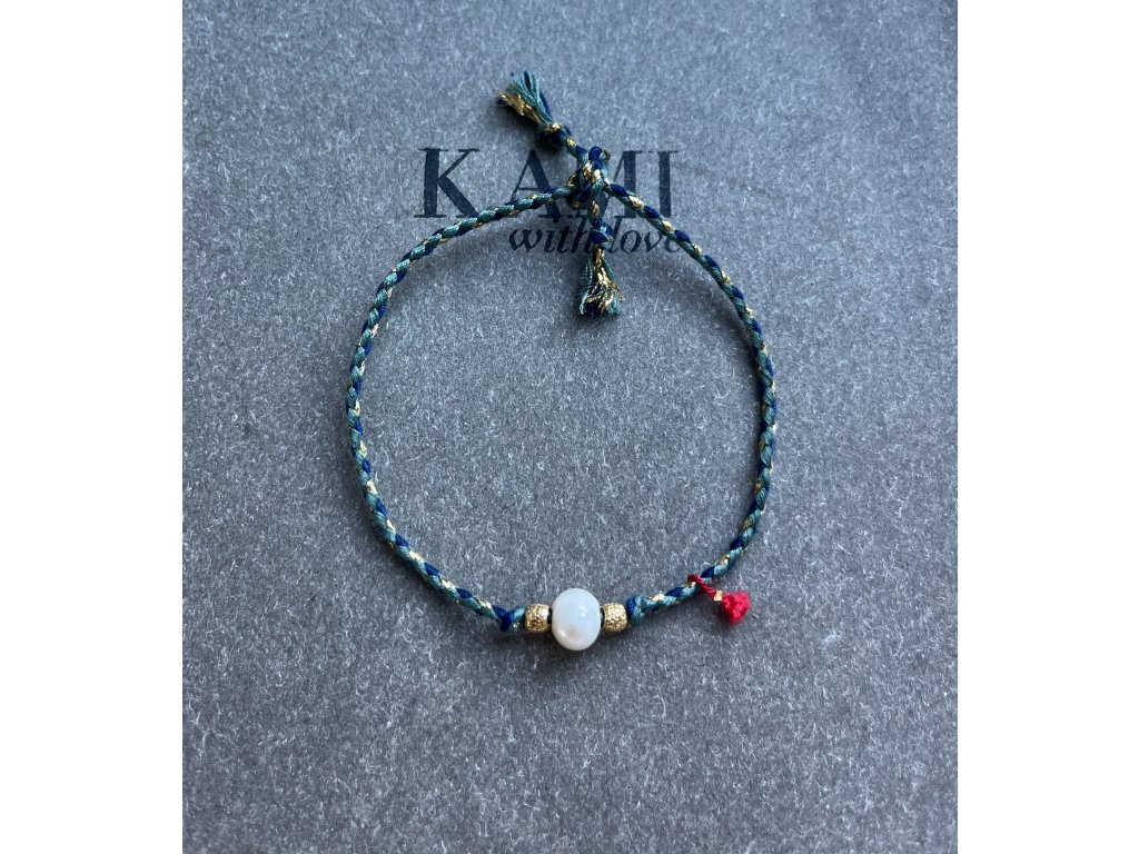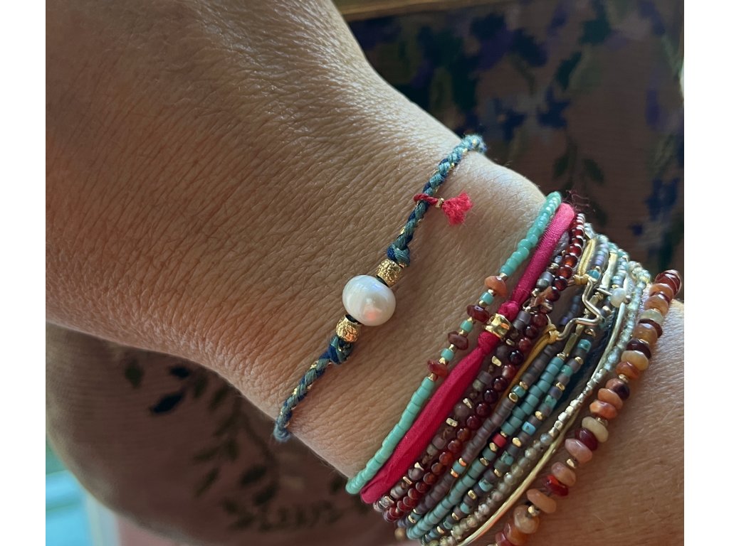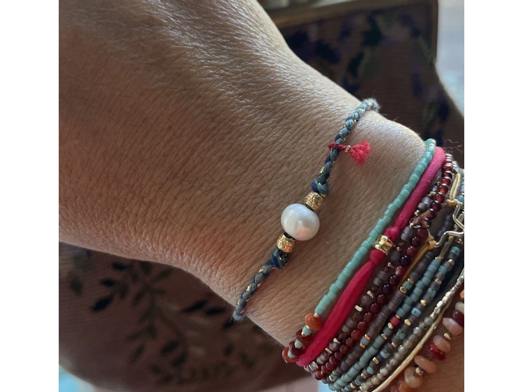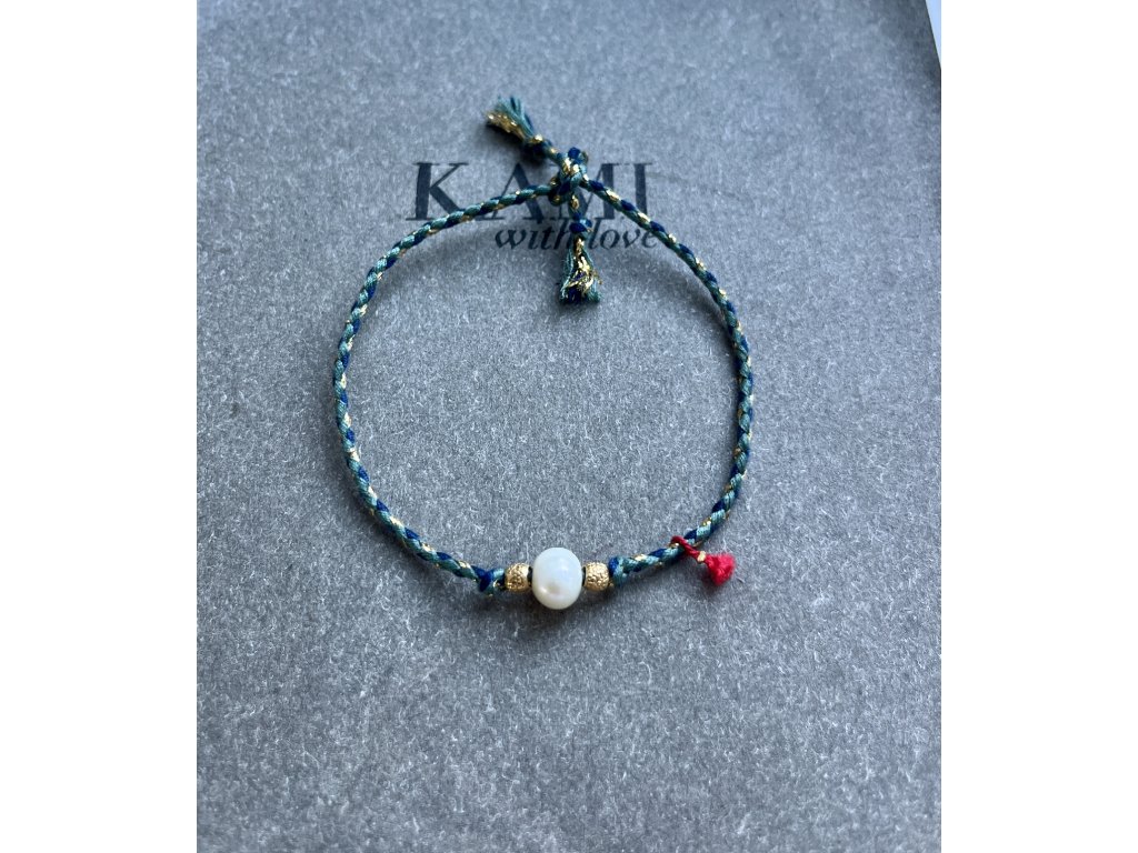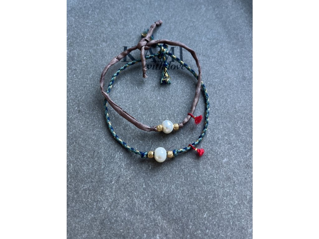Náramek z francouzské bavlněné šňůrky s perlou a zlacenými korálky (Ag925), úvaz na uzlík.