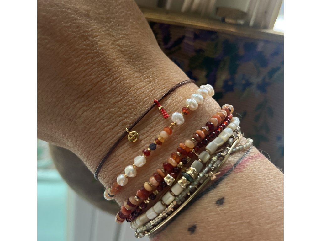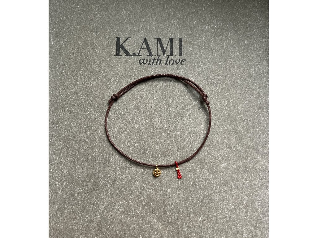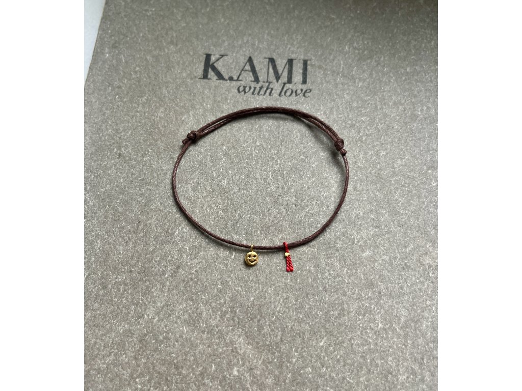 Náramek z hnědé voskované bavlněné šňůrky se zlaceným smajlíkem (Ag925) a hedvábnou šňůrkou se zlacenou fazetou (Ag925), posuvný úvaz.