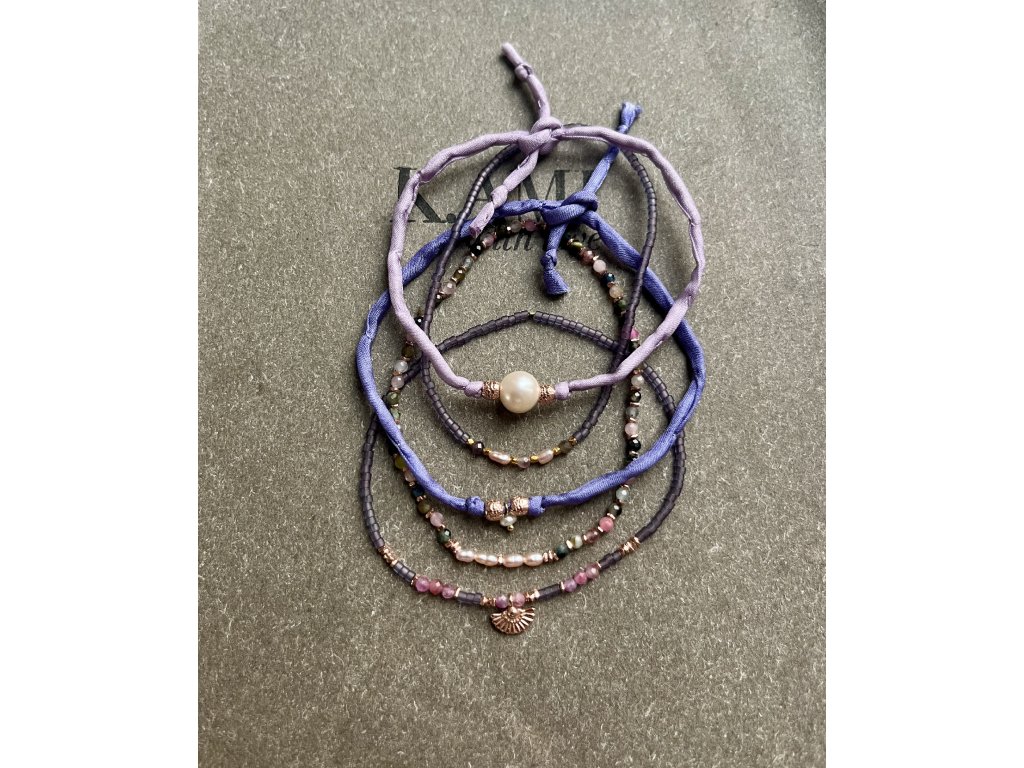 Náramek z hedvábné šňůrky s perlou a zlacenými korálky Ag925