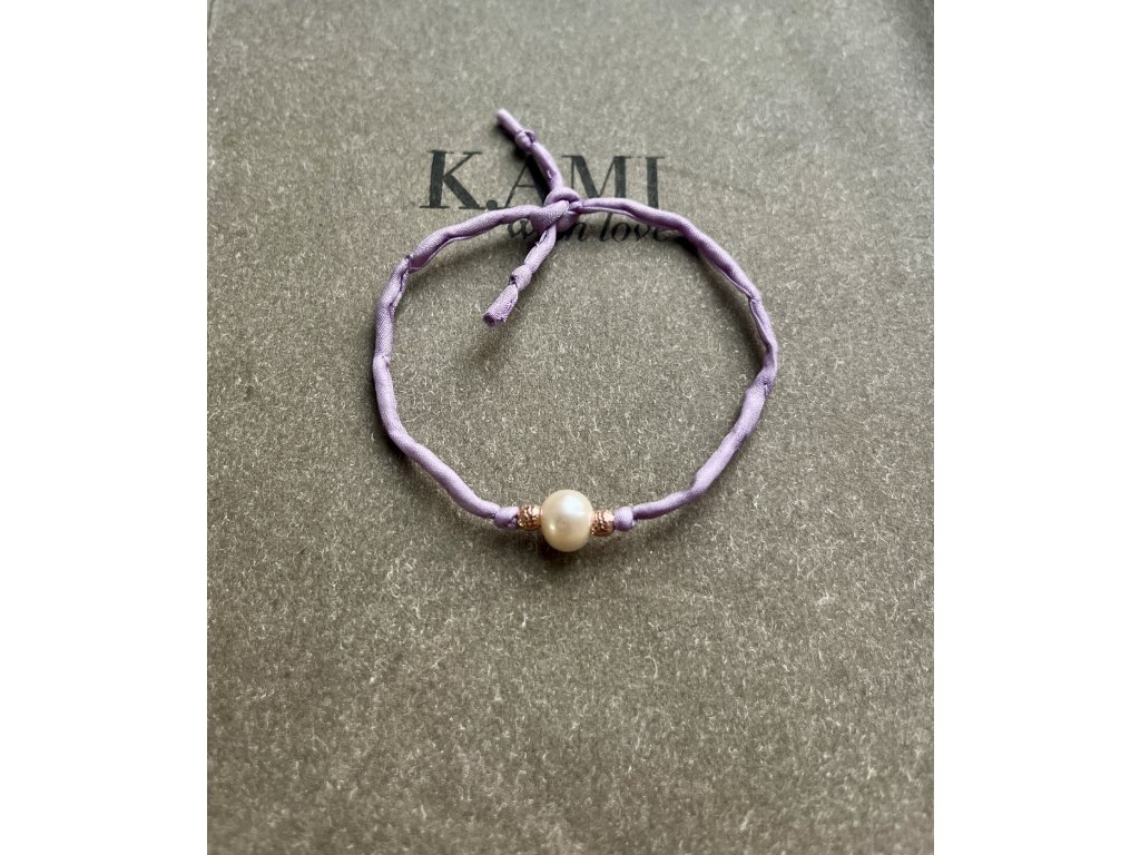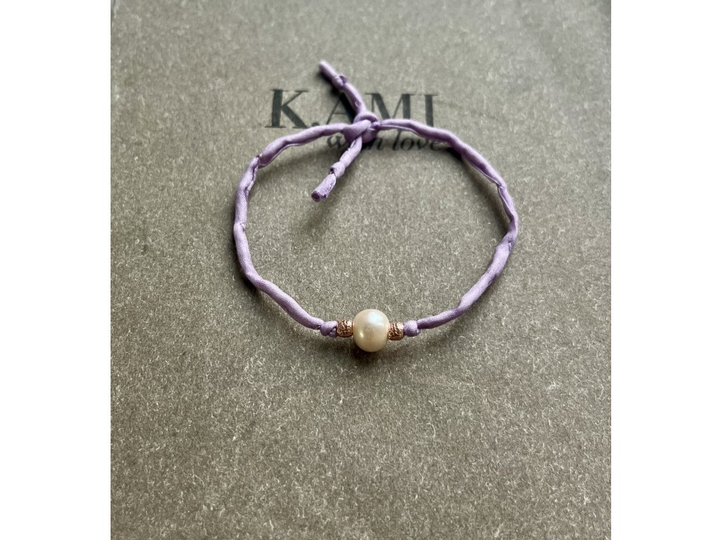 Náramek z hedvábné šňůrky s říční perlou a korálky zlacenými růžovým zlatem (Ag925), úvaz na uzlík.