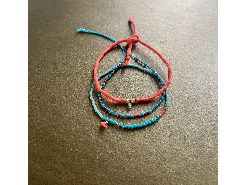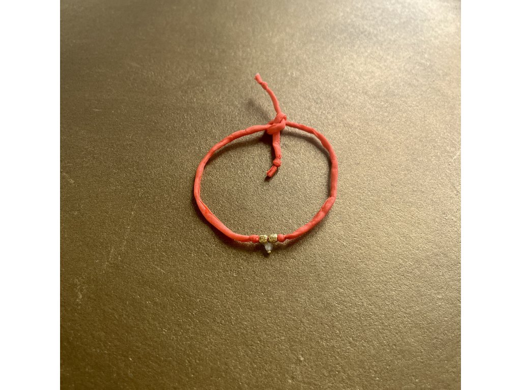 Náramek z ručně barvené hedvábné šňůrky s kamínkem (turmalín) a zlacenými korálky (Ag925), úvaz na uzlík.