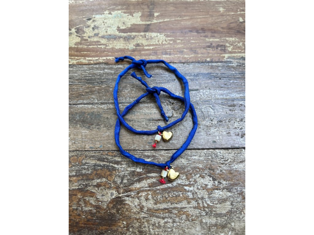 Náramek z modré hedvábné šňůrky se zlaceným srdíčkem (Ag925, vermeil gold) a perlou se zlacenou fazetou, úvaz na uzlík.