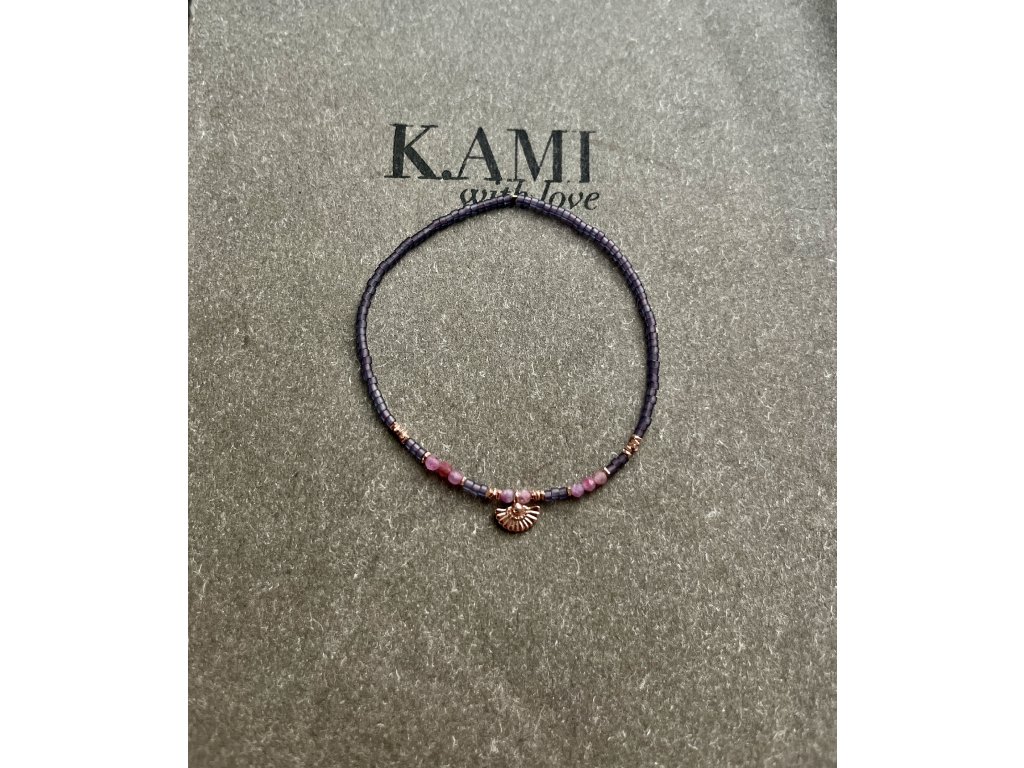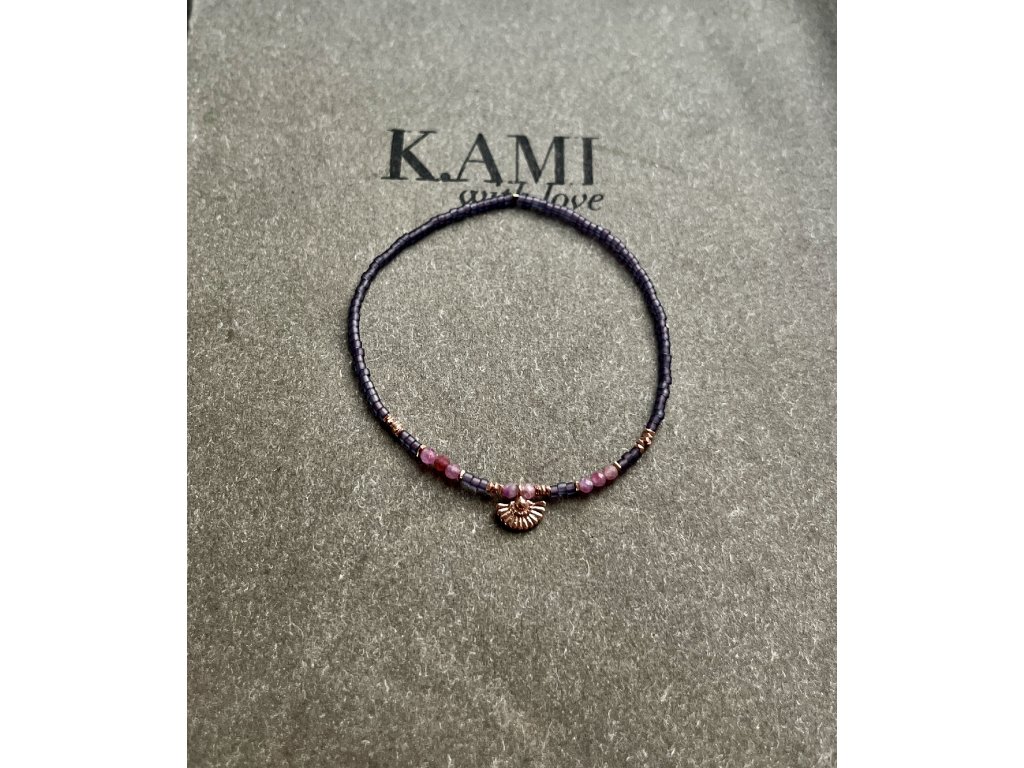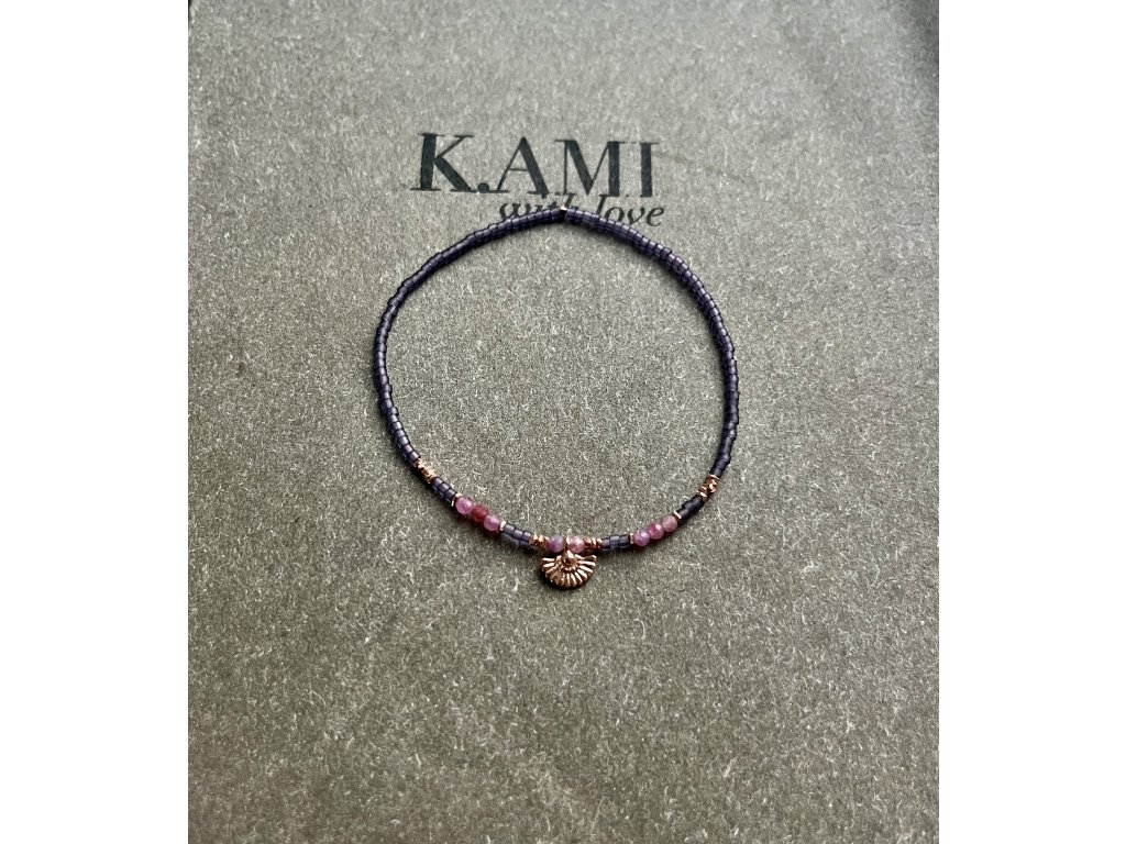 Náramek z japonských rokajlů a fazet s vějířkem zlacenými růžovým zlatem (Ag925) s turmalíny, pružný návlek.