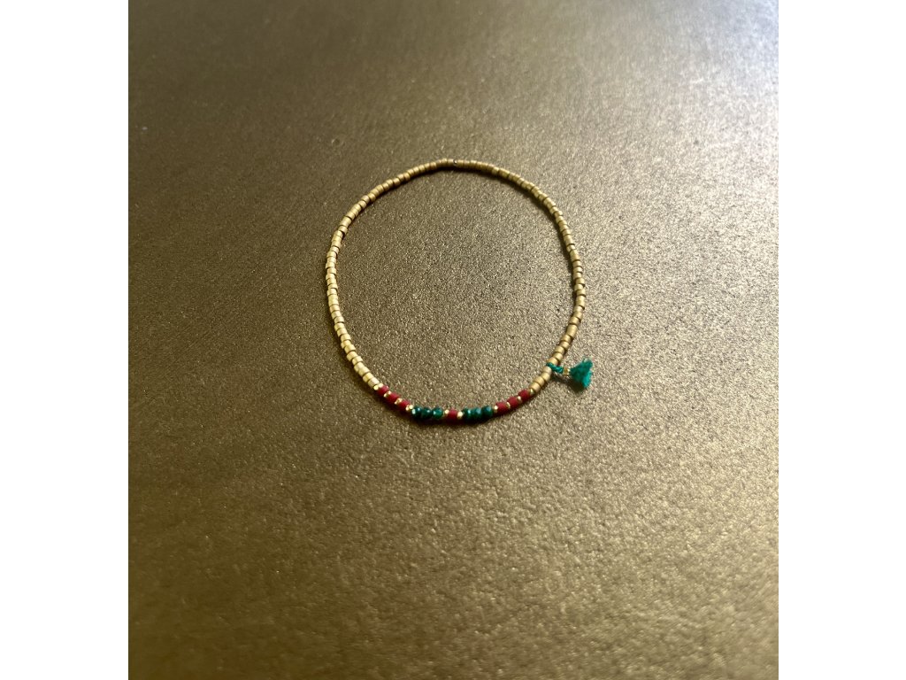 Náramek z japonských rokajlů se zlacenými fazetami (Ag925) a malachity, pružný návlek.