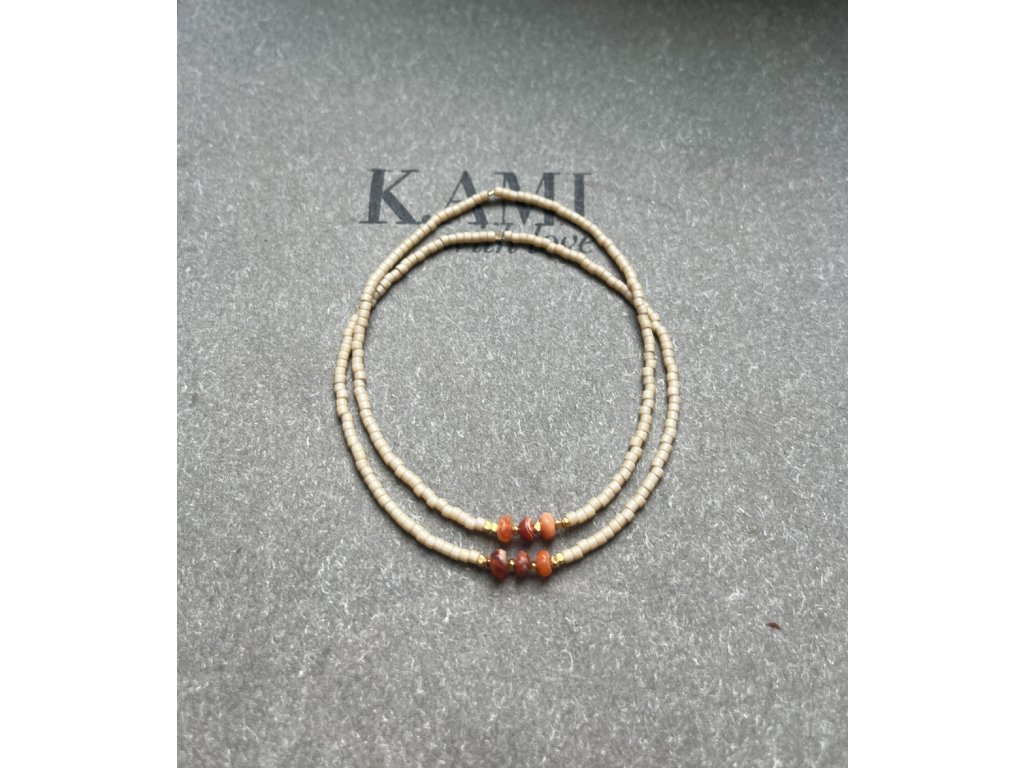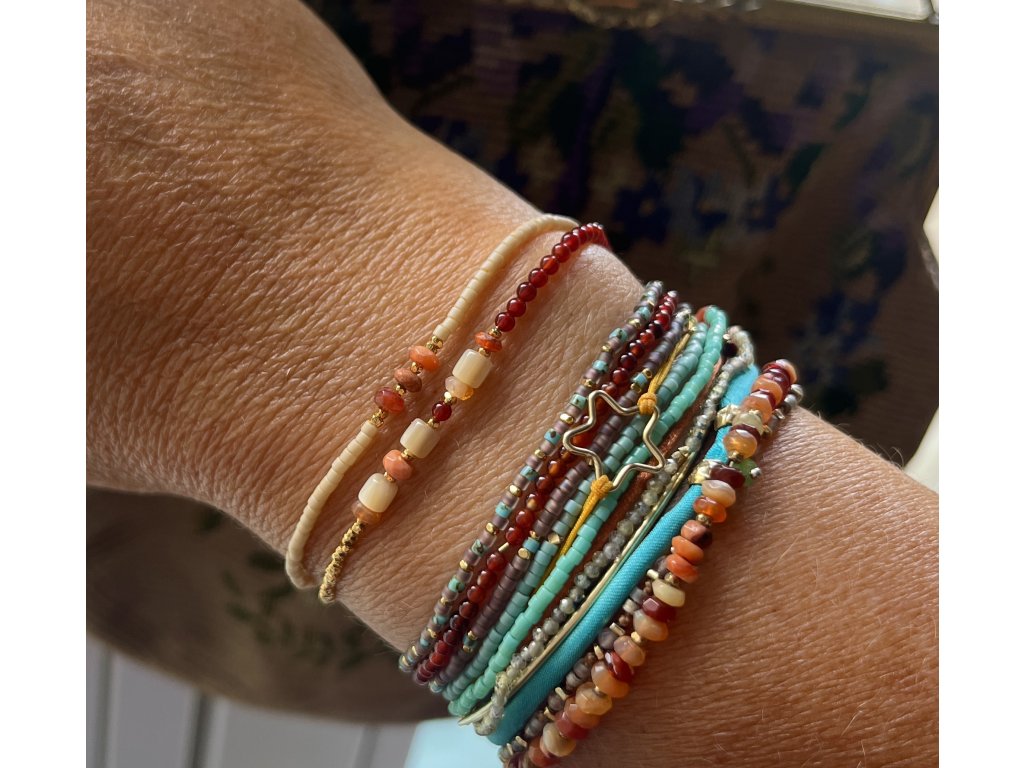 Náramek z japonských rokajlů se zlacenými fazetami (Ag925) a mexickými opály, pružný návlek.
