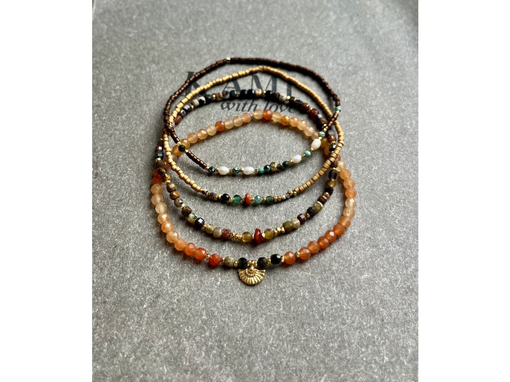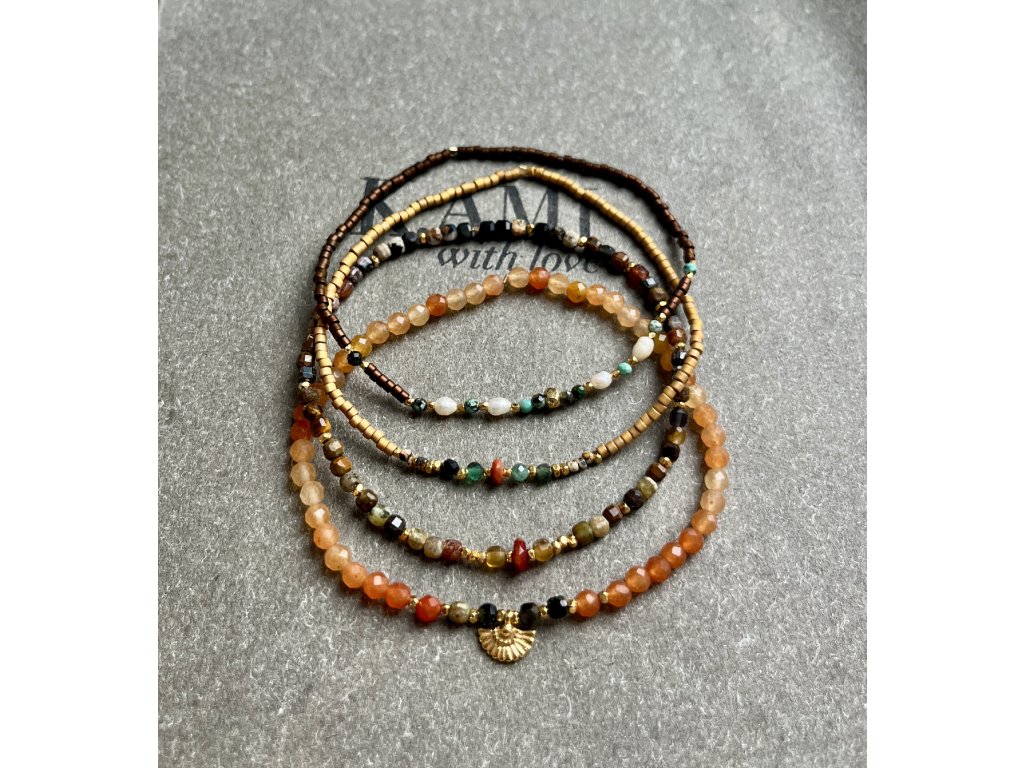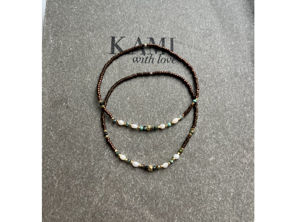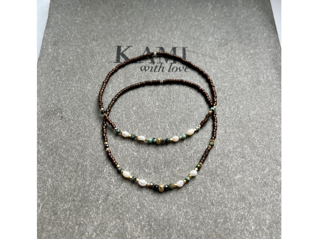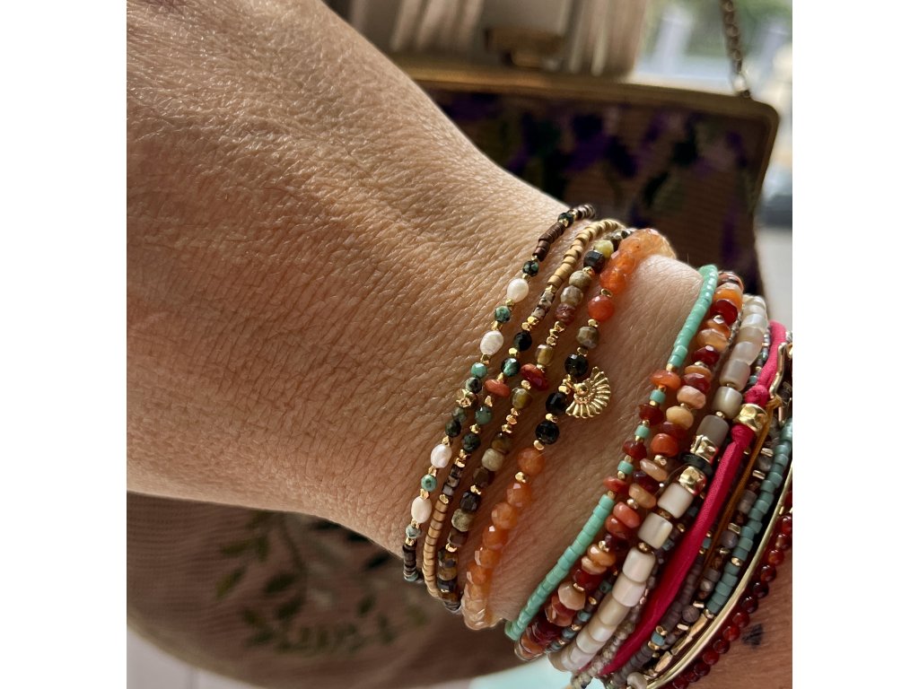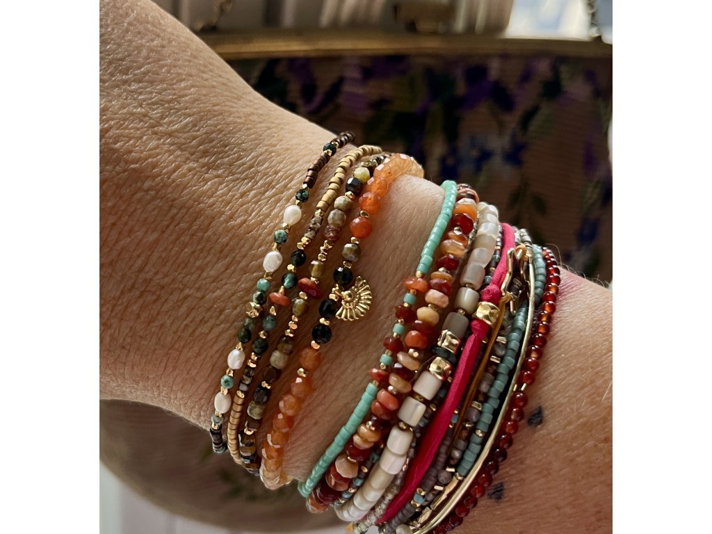 Náramek z japonských rokajlů se zlacenými fazetami (Ag925), říčními perličkami a africkými tyrkysy, pružný návlek.