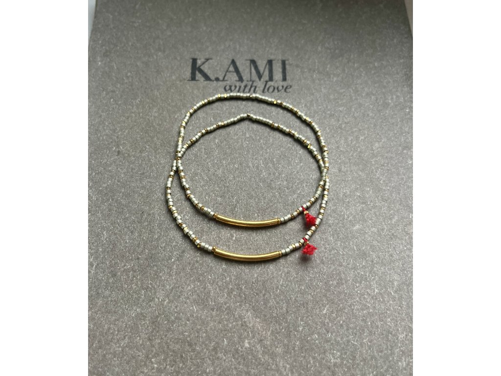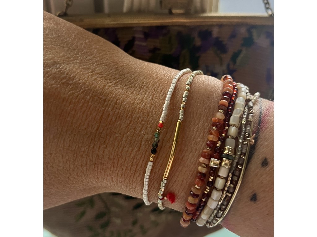 Náramek z japonských rokajlů se zlacenou trubičkou a zlacenými fazetami (Ag925), pružný návlek.