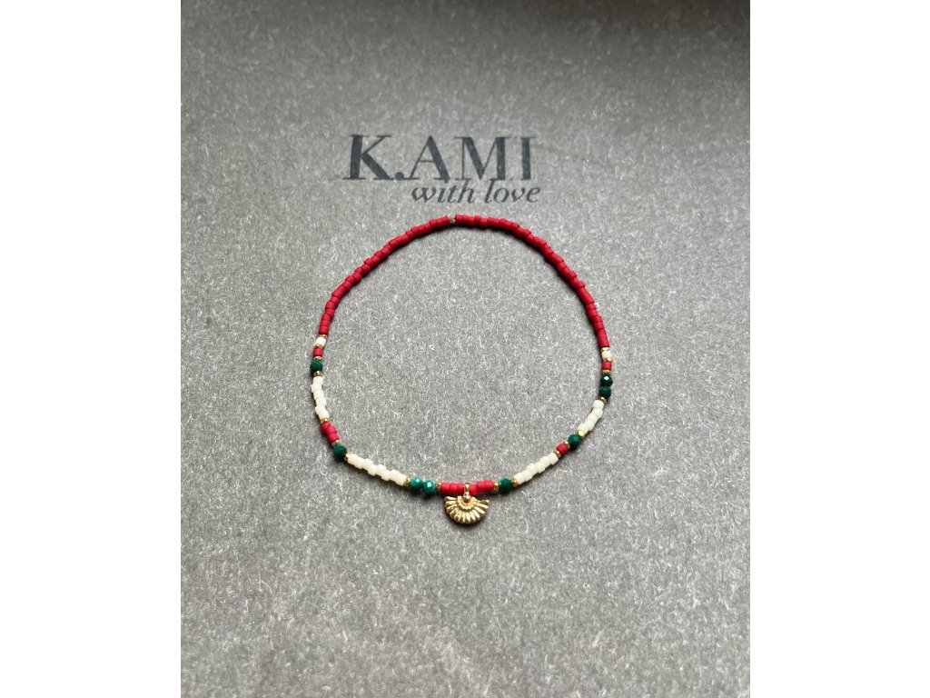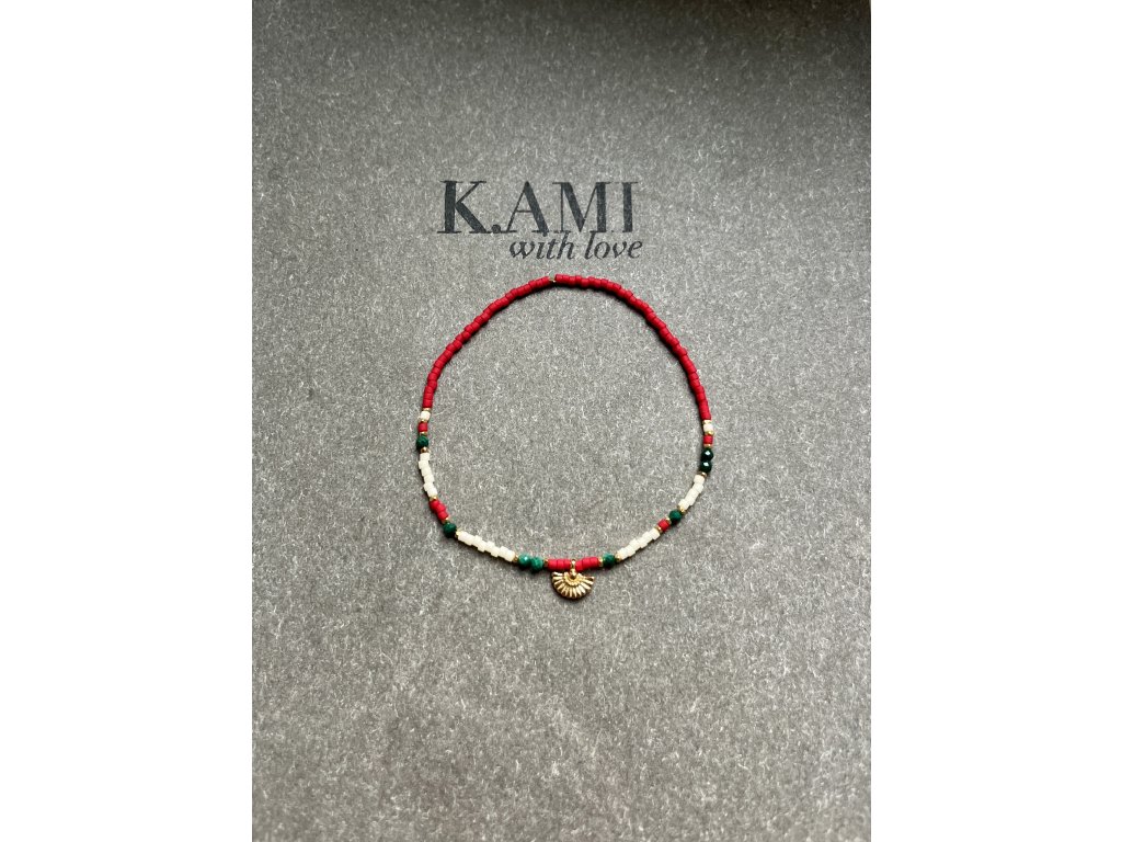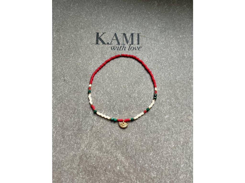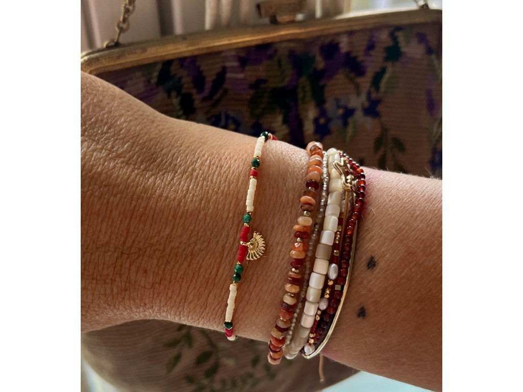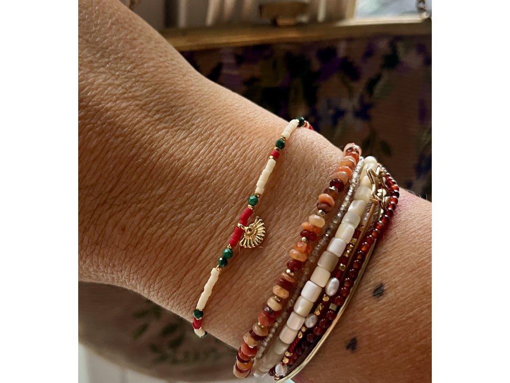 Náramek z japonských rokajlů se zlaceným vějířkem a malachity Ag925
