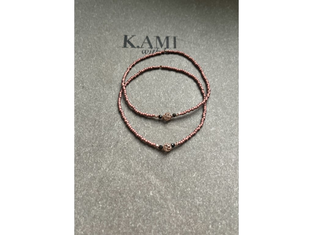 Náramek z japonských rokajlů s turmalíny, fazetami a zdobným korálkem zlacenými růžovým zlatem (Ag925), pružný návlek.