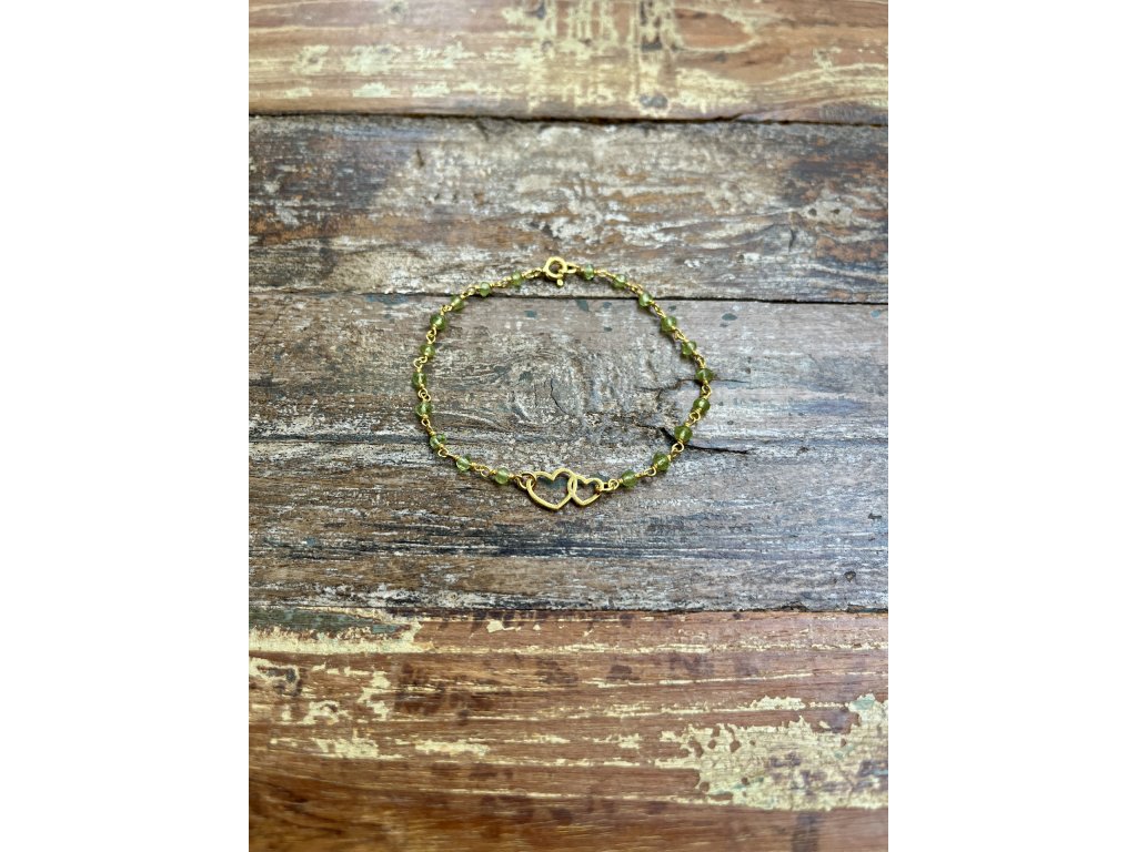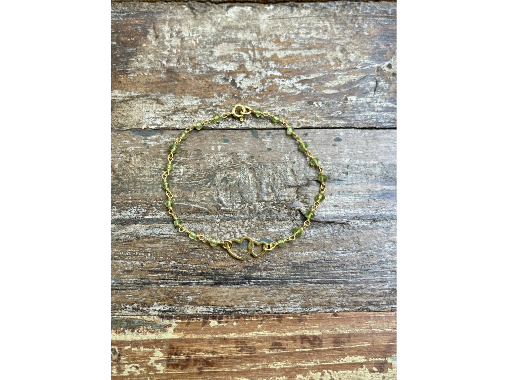 Elegantní jemný náramek ze zeleného peridotu se spojenými zlacenými srdíčky (Ag925), zlacené zapínání (Ag925).