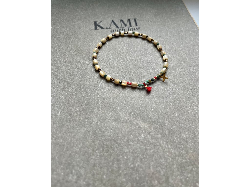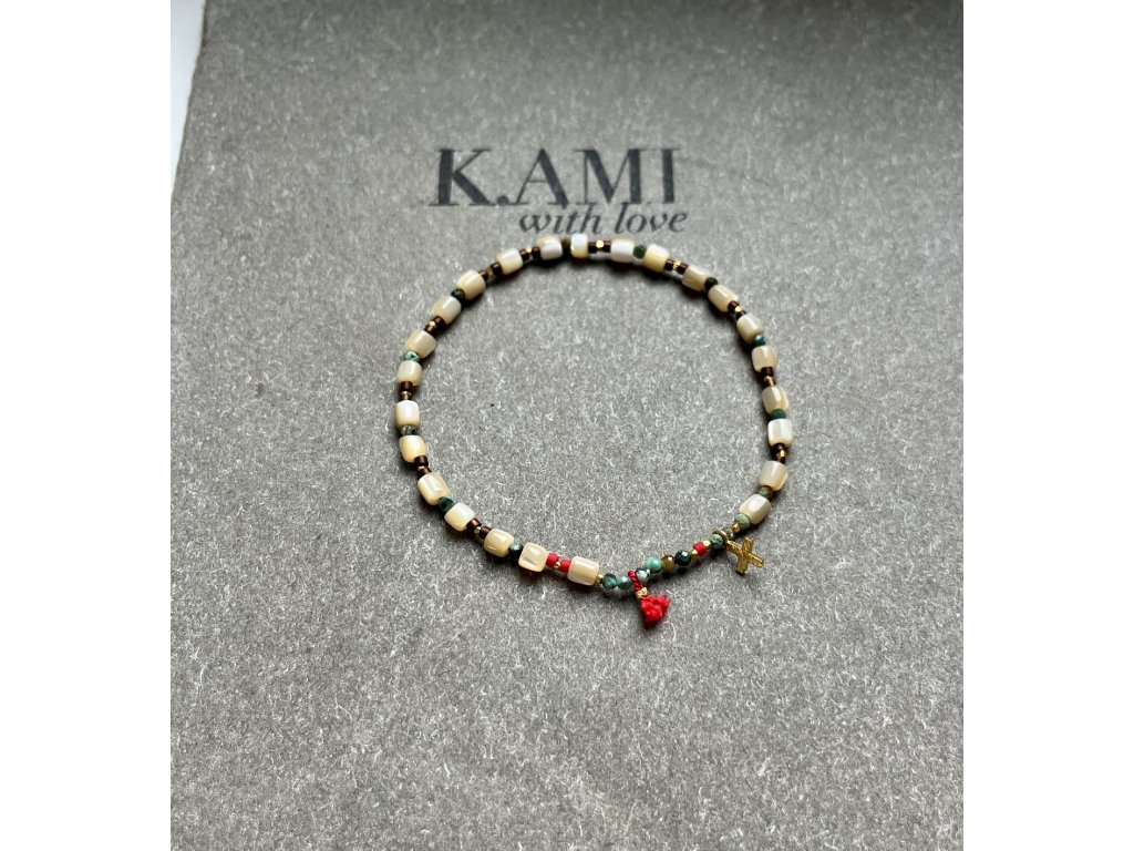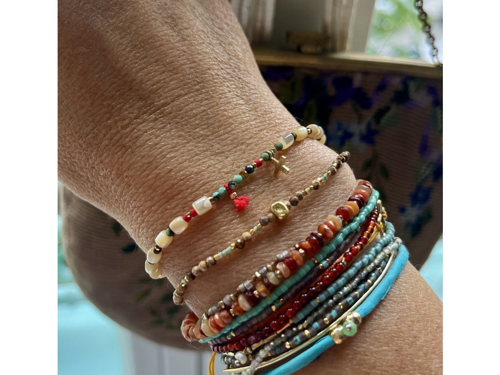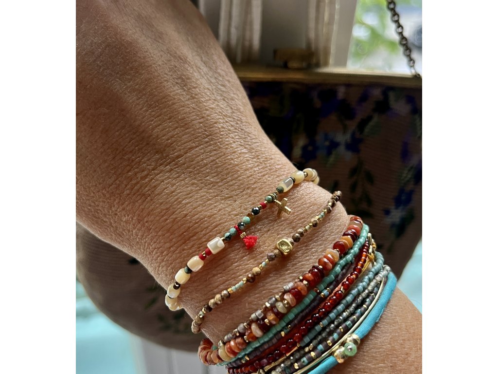 Náramek z perleti s africkými tyrkysy, zlacenými fazetami, japonskými rokajly a zlaceným křížkem (Ag925), pružný návlek.