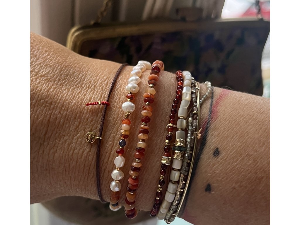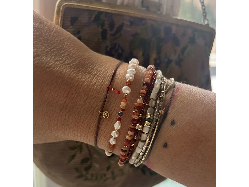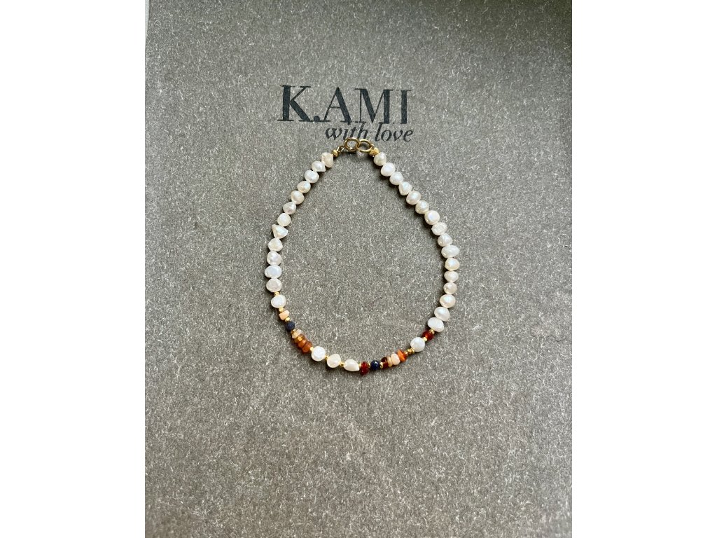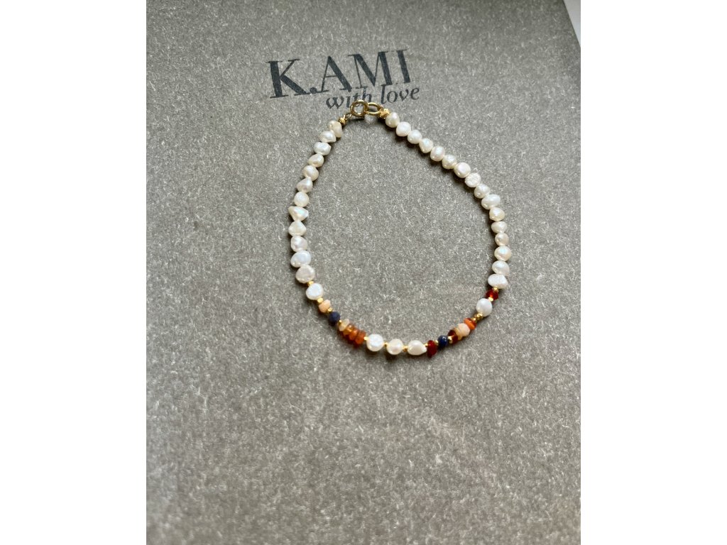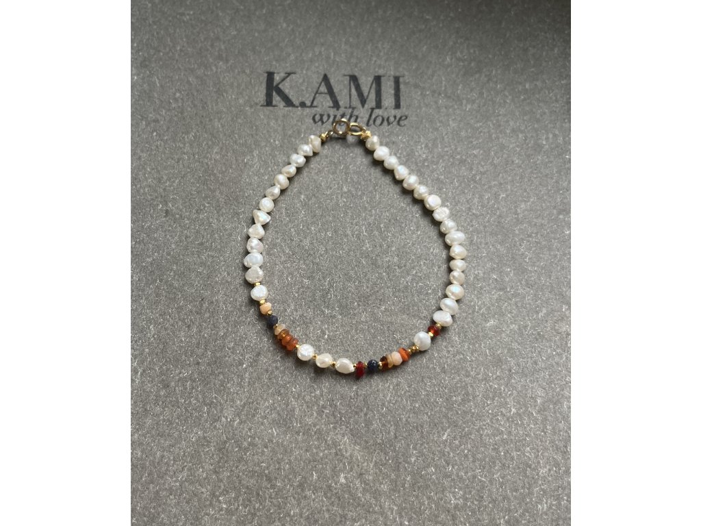 Náramek z říčních perliček se safíry, zlacenými fazetami a mexickými opály (Ag925) na pozlaceném lanku se zlaceným zapínáním (Ag925).