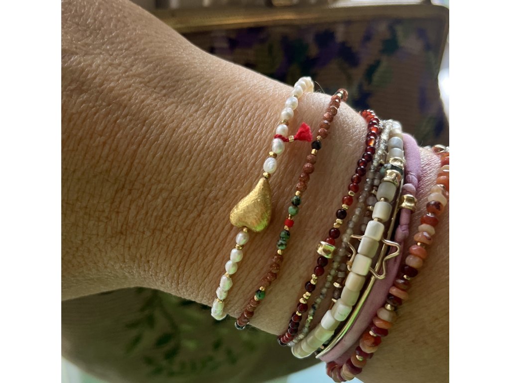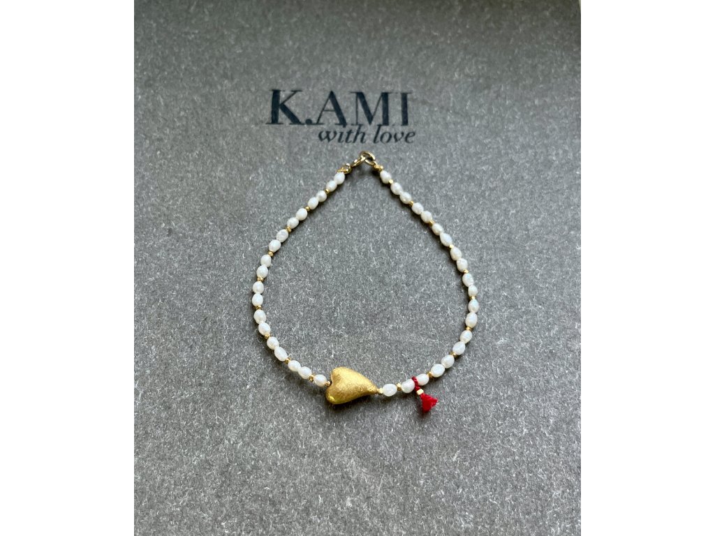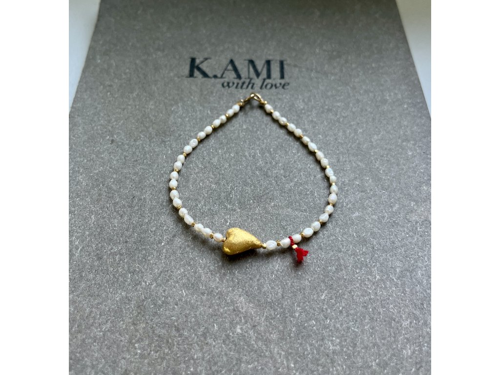 Náramek z říčních perliček a zlacených fazet s kartáčovaným zlaceným srdíčkem (Ag925) na zlaceném lanku se zlaceným zapínáním (Ag925).
