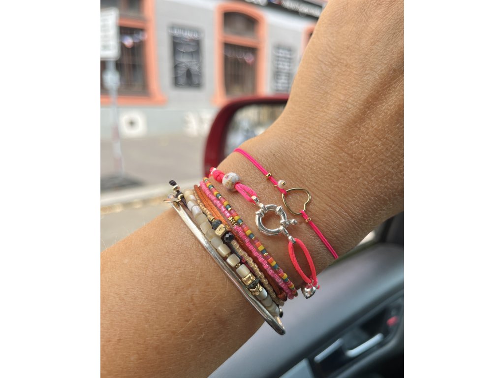 Náramek ze shambala šňůrky se zlacenými korálky, zlaceným srdíčkem (gold filled, Ag925) a perličkou, posuvný úvaz.