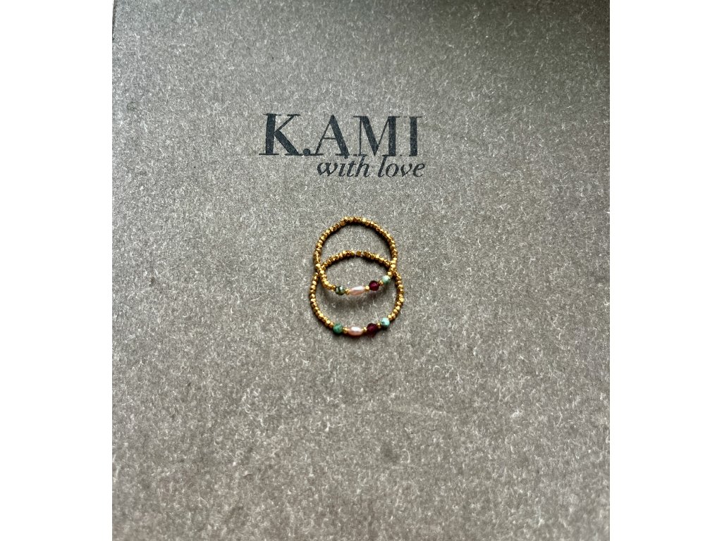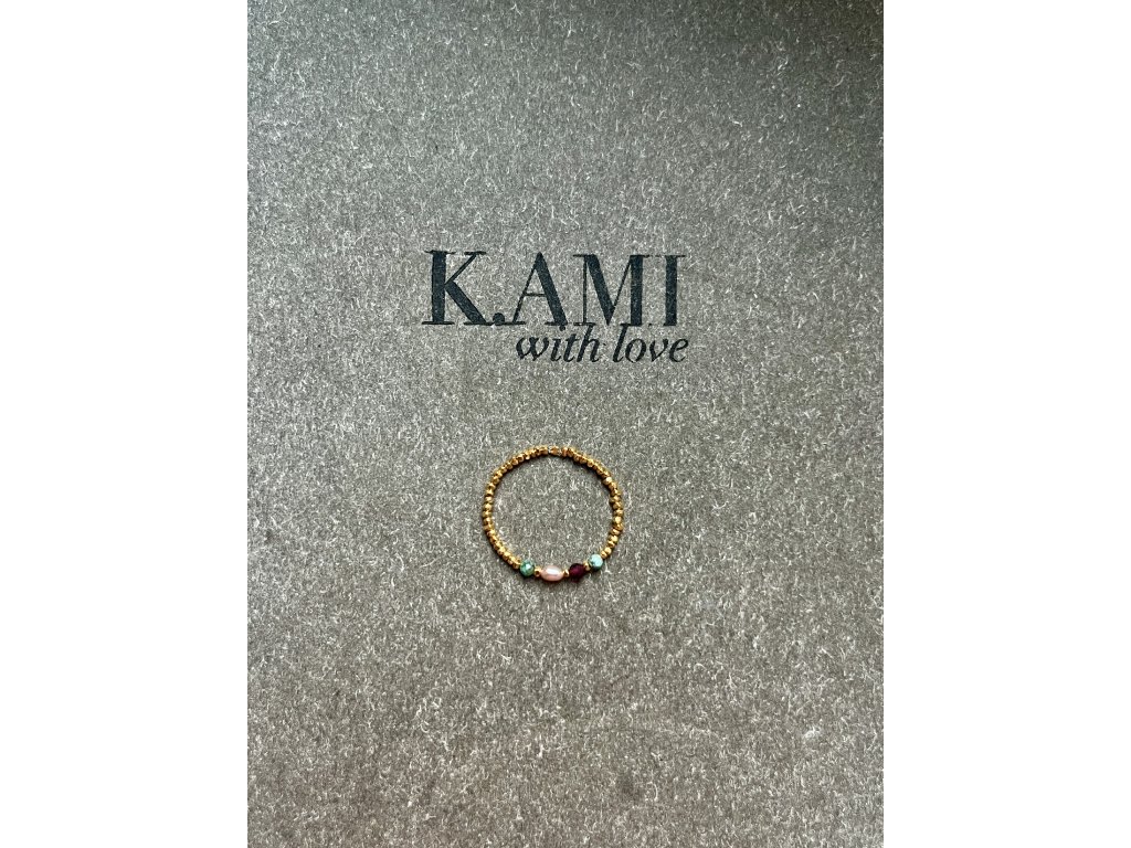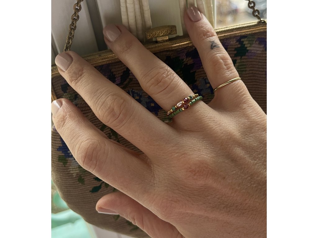 Prstýnek ze zlacených fazet (Ag925) s tyrkysy, říční perličkou a granátem, pružný návlek.