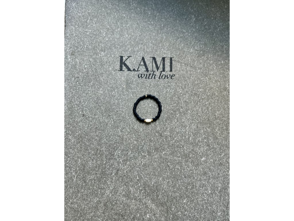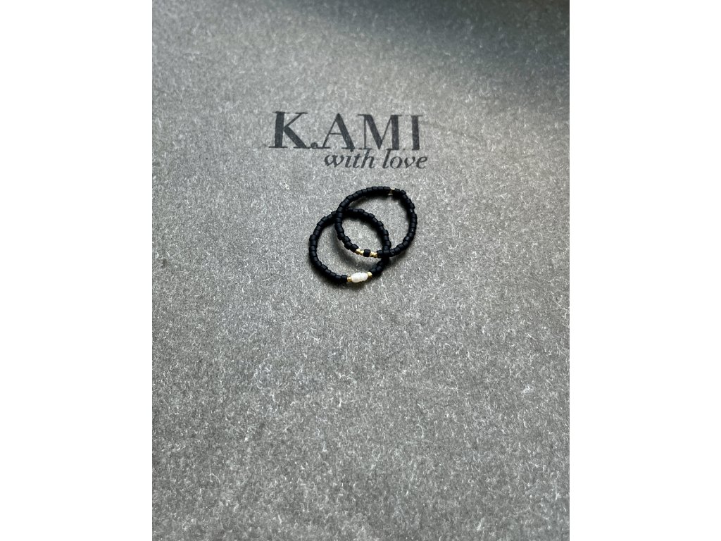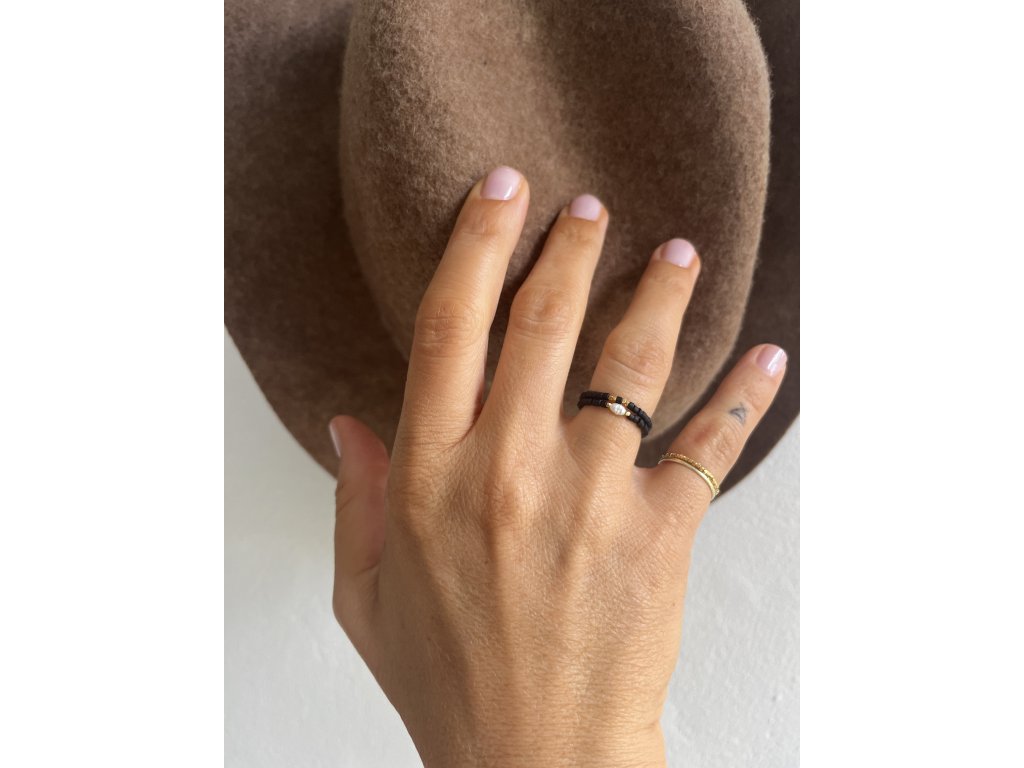 Černý prstýnek z japonských rokajlů se zlacenými fazetami a perličkou (Ag925), pružný návlek.