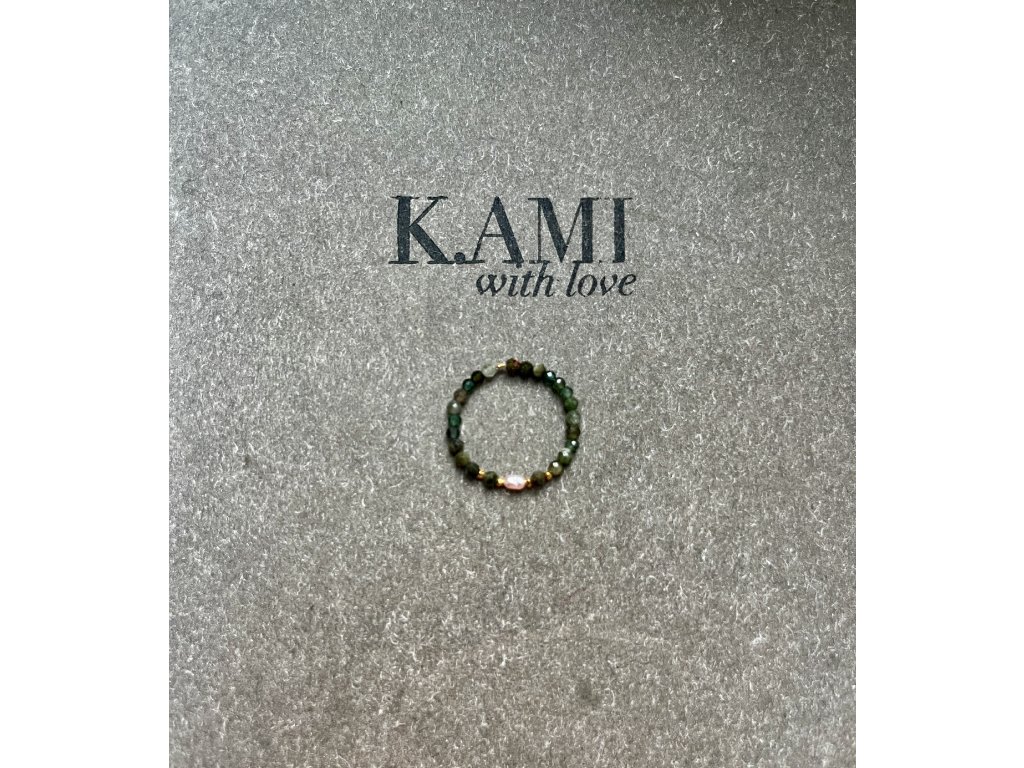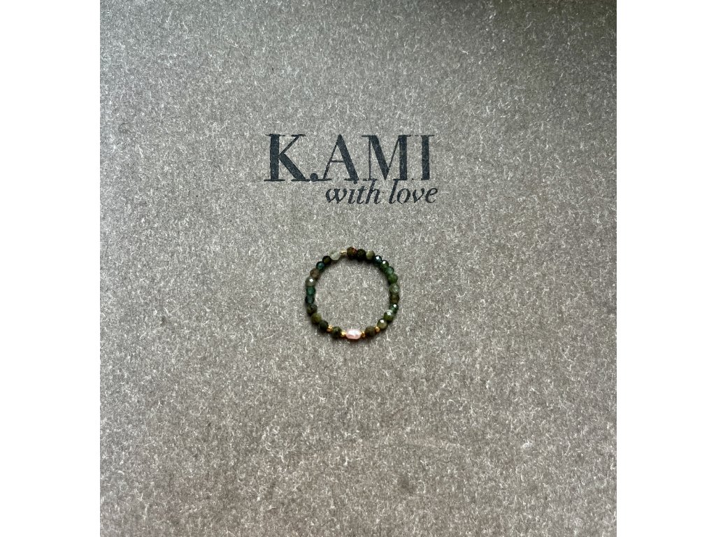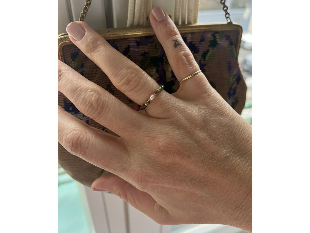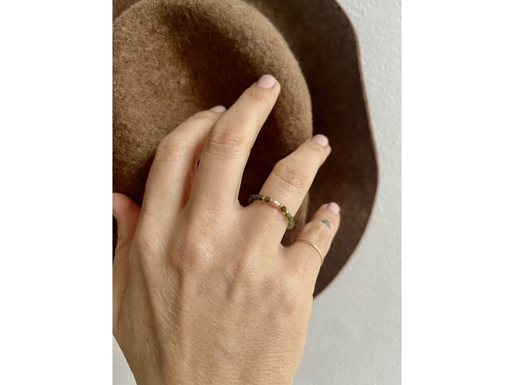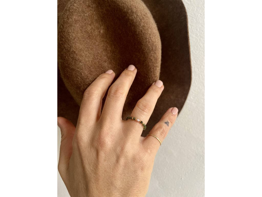 Prstýnek z turmalínů se zlacenými fazetami (Ag925) a říční perličkou, pružný návlek.