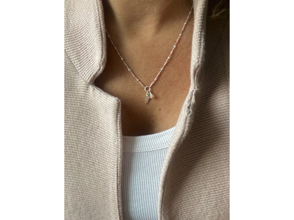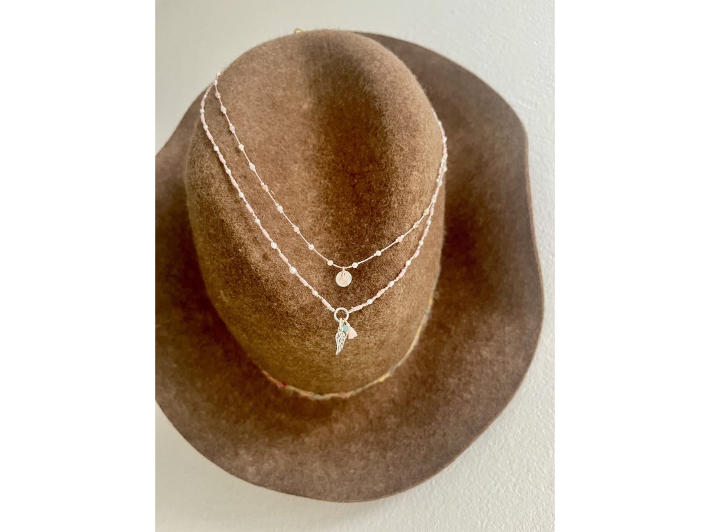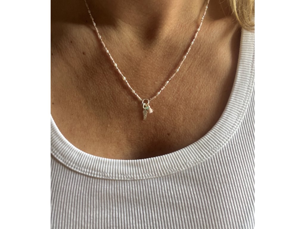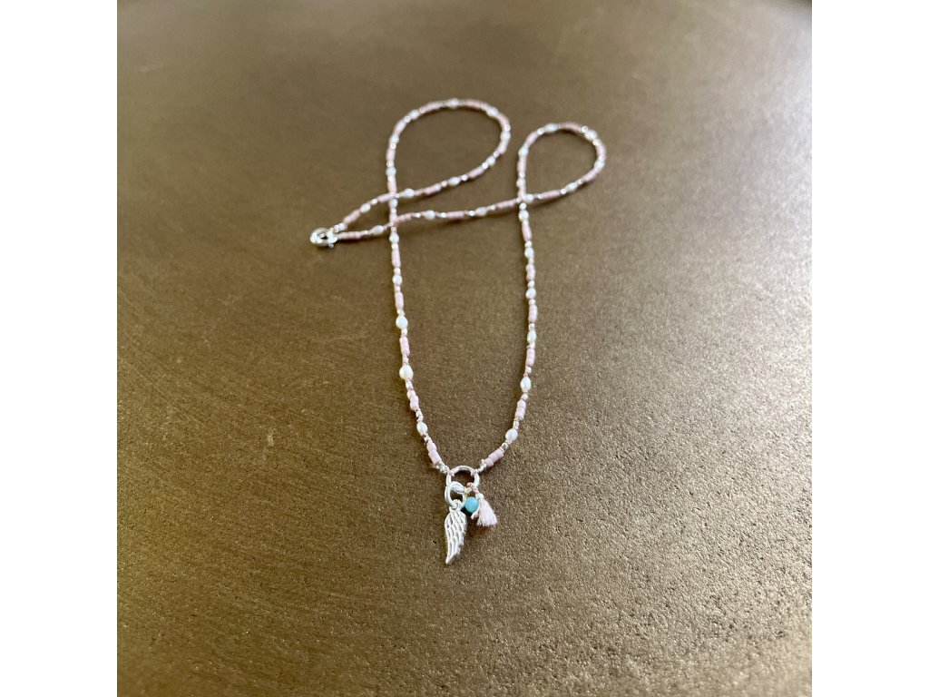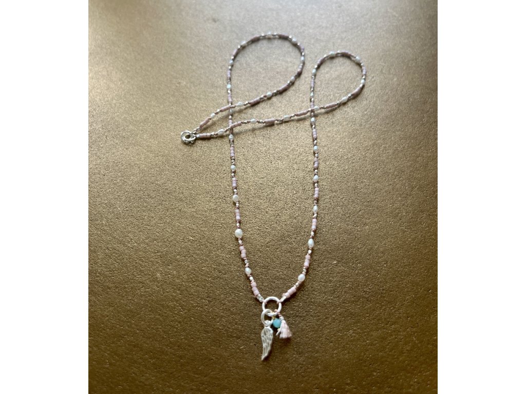Boho řetízek z říčních perliček se stříbrným andělským křídlem Ag925