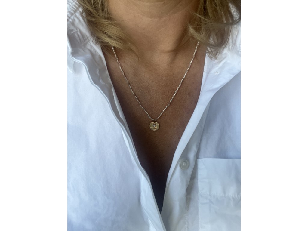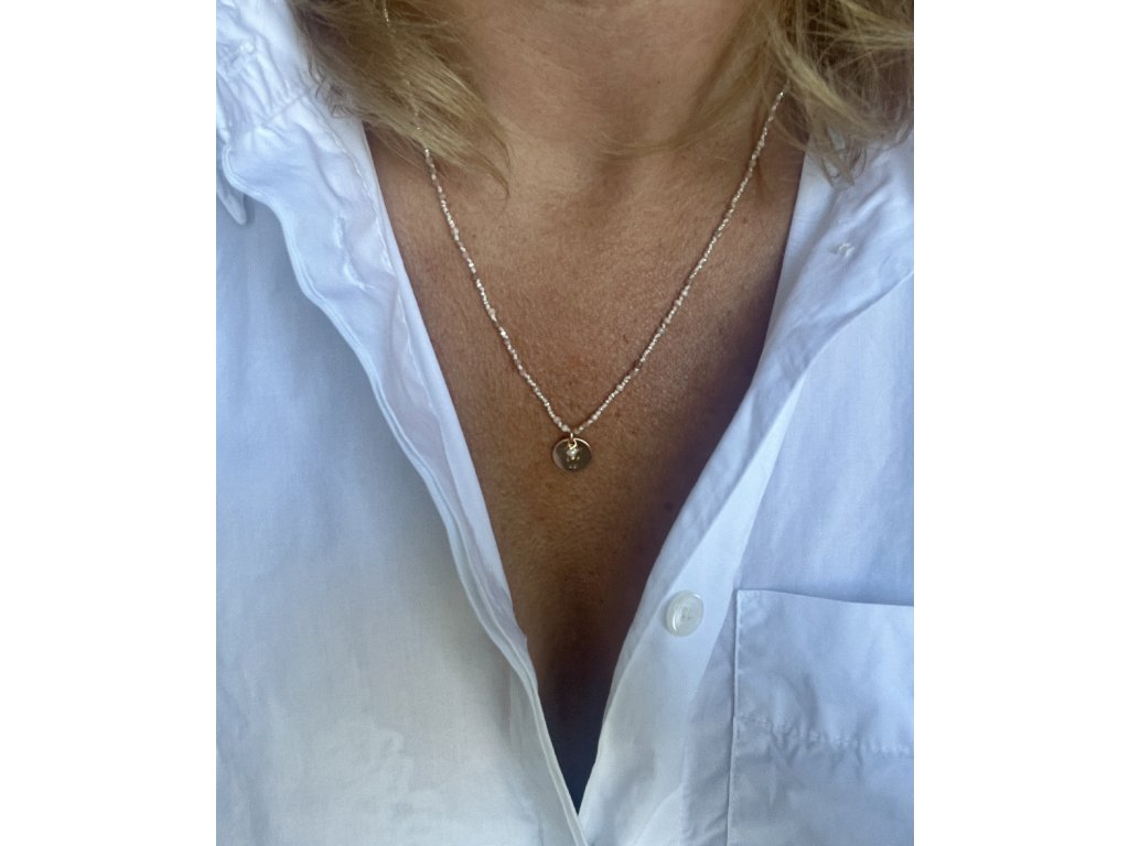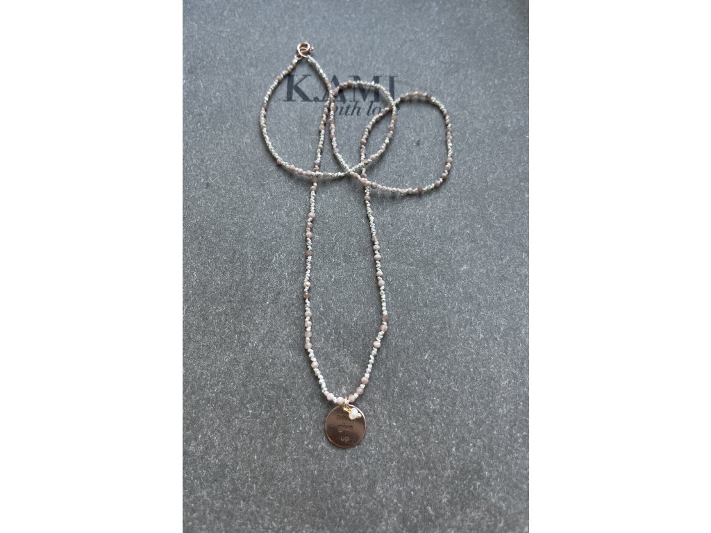 Ručně dělaný řetízek z rodochrozitu se stříbrnými fazetami a přívěskem Never Give Up zlaceným růžovým zlatem (Ag925) s perličkou (Ag925), zlacené zapínání (Ag925).