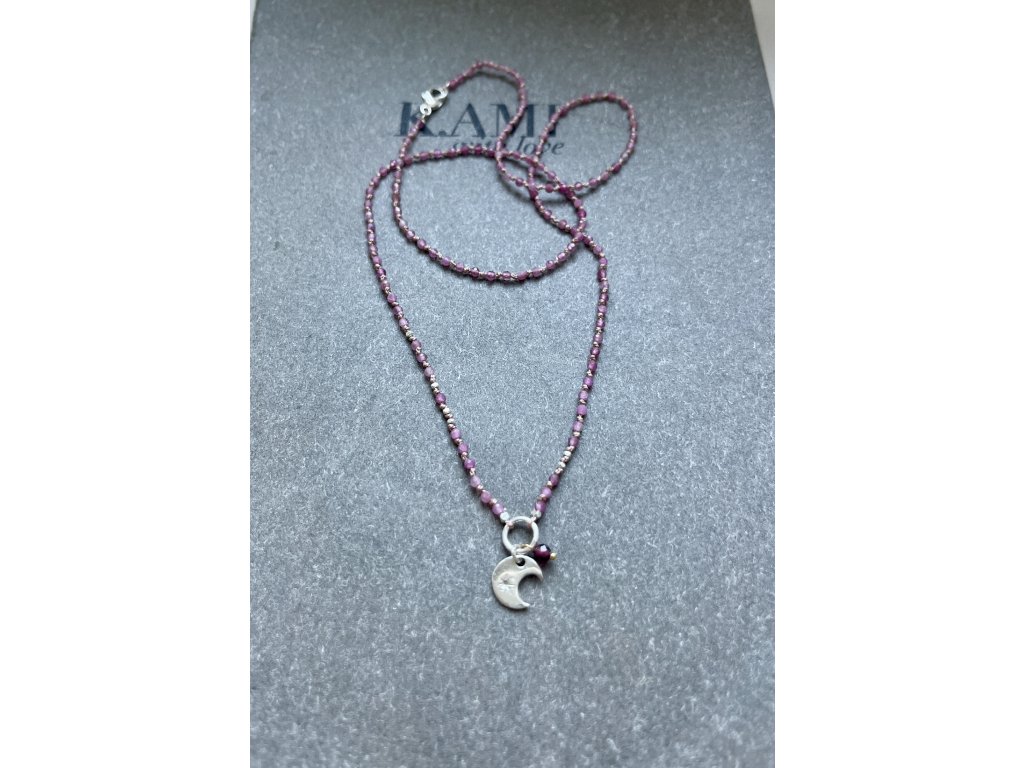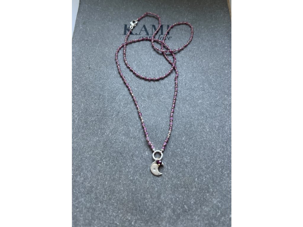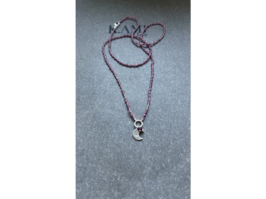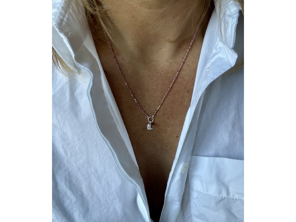 Ručně dělaný řetízek z růžového turmalínu a stříbrných fazet (Ag925) se stříbrným měsíčkem (Ag925) a kamínkem (rubín), stříbrné zapínání (Ag925).