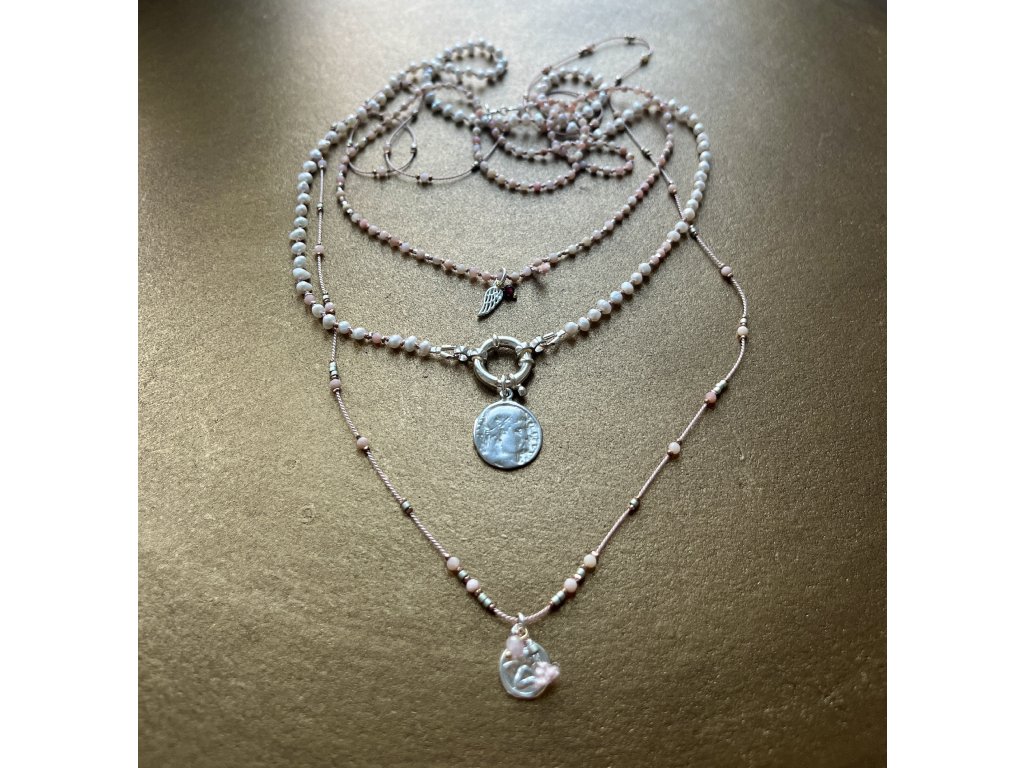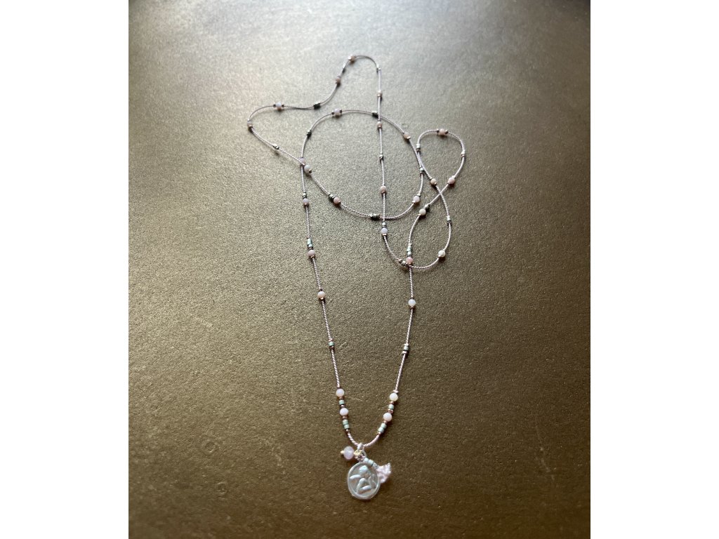 Dlouhý náhrdelník z růžového opálu, japonských rokajlů a fazet zlacených růžovým zlatem se stříbrným andělíčkem (Ag925), kamínkem a střapečkem z hedvábné šňůrky.
