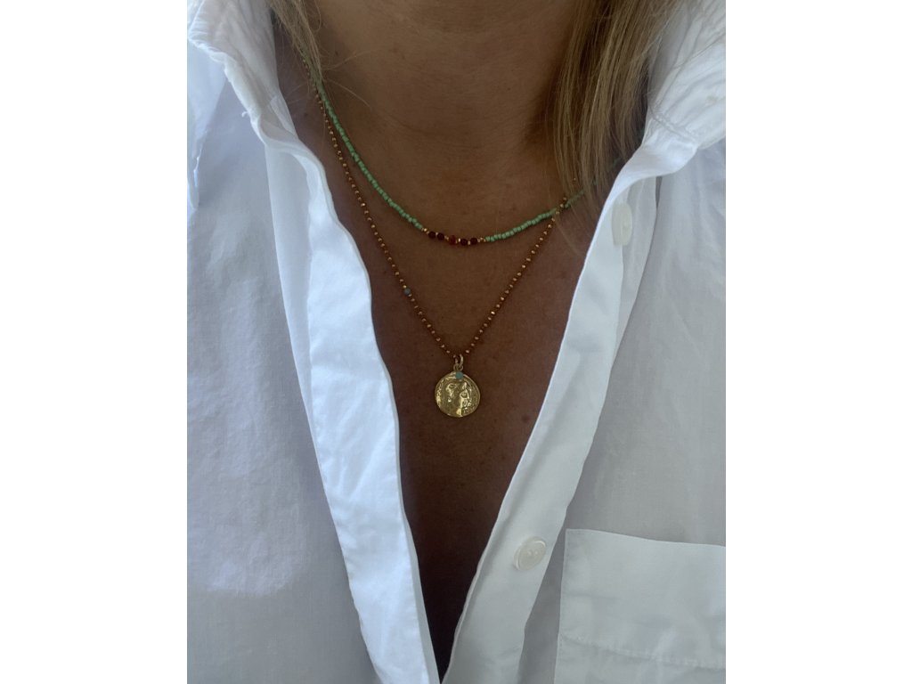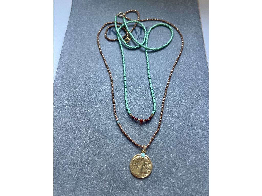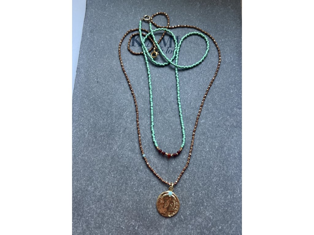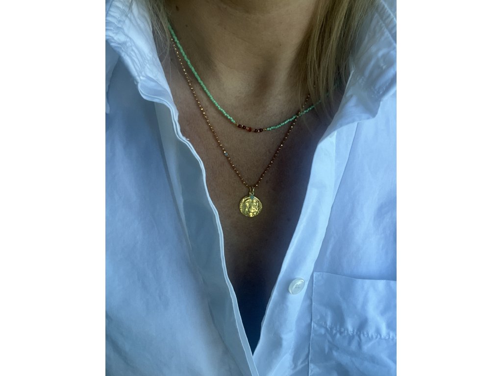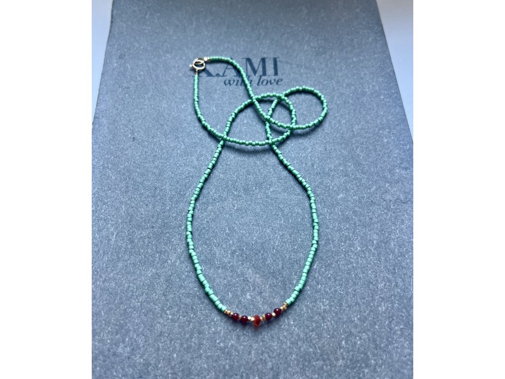 Krátký řetízek z japonských rokajlů se zlacenými fazetami, karneoly a mexickým opálem (Ag925), zlacené zapínání (Ag925).