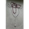 Dlouhý náhrdelník z japonských rokajlů s perličkami, stříbrnými sekanými korálky (Ag925), granátem a střapcem, pružný návlek přes hlavu.