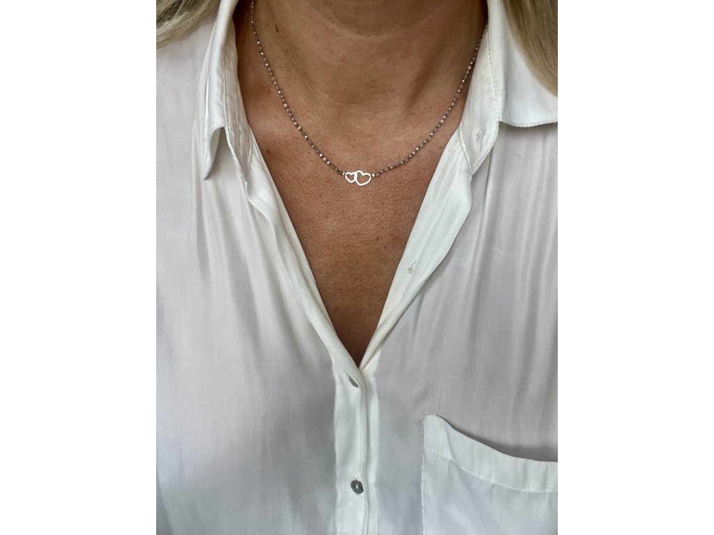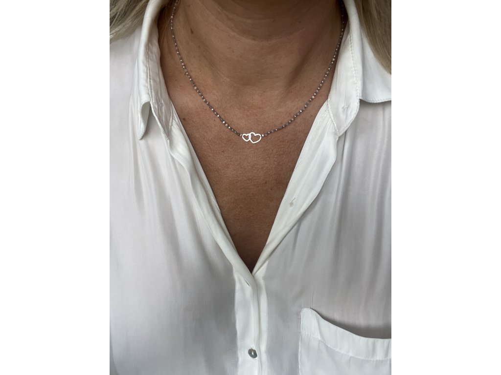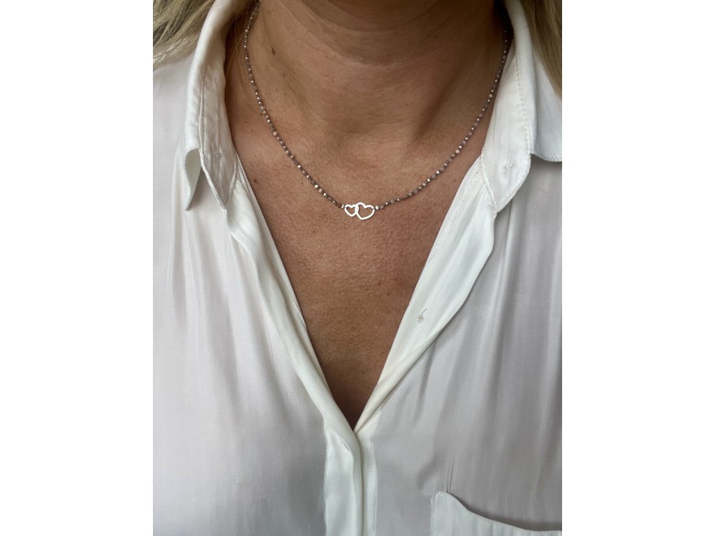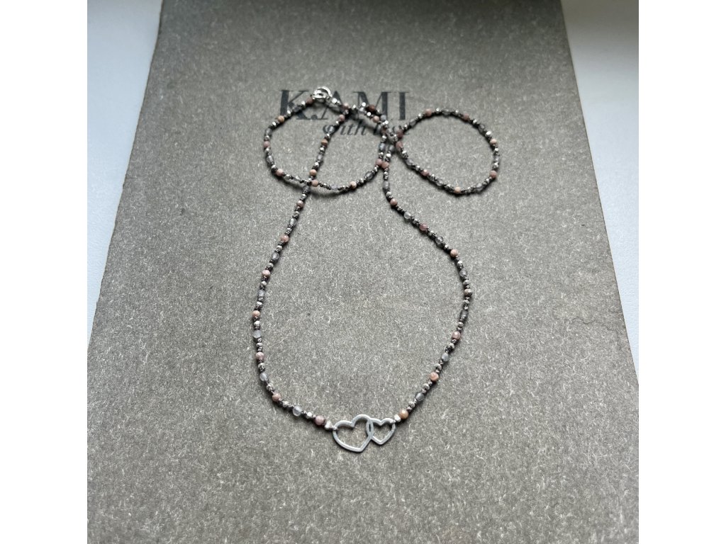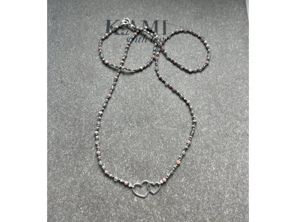 Ručně dělaný náhrdelník z labradoritu a rodochrozitu se stříbrnými fazetami a spojenými stříbrnými srdíčky (Ag925), stříbrné zapínání (Ag925).