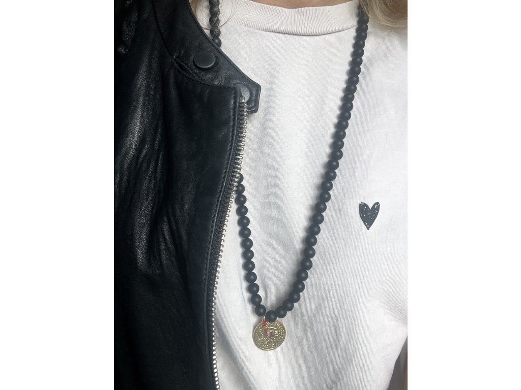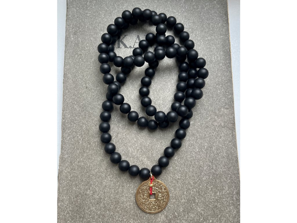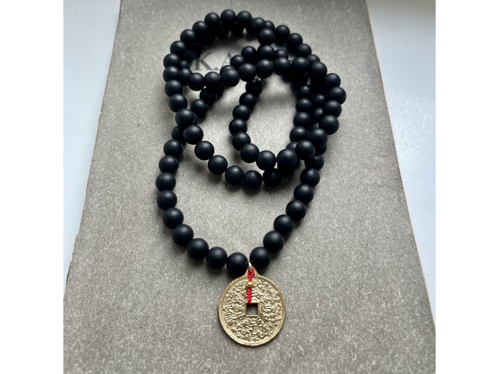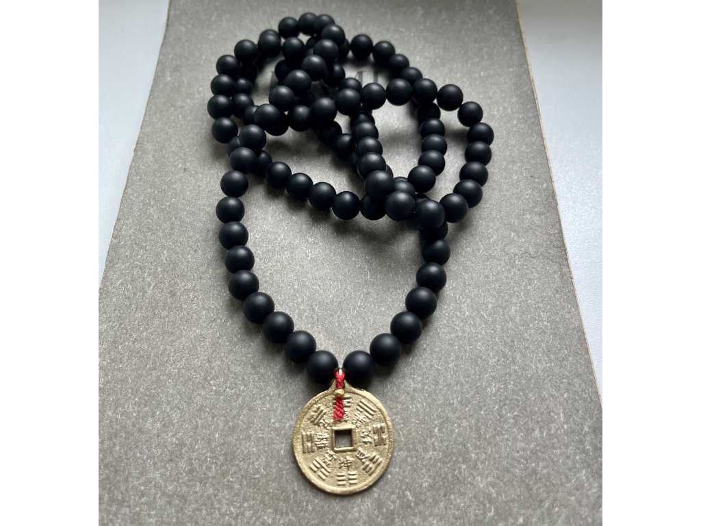 Náhrdelník z matného černého onyxu s cínovým medailonem symbolizujícím čínský horoskop a střapečkem z hedvábné šňůrky, návlek přes hlavu.