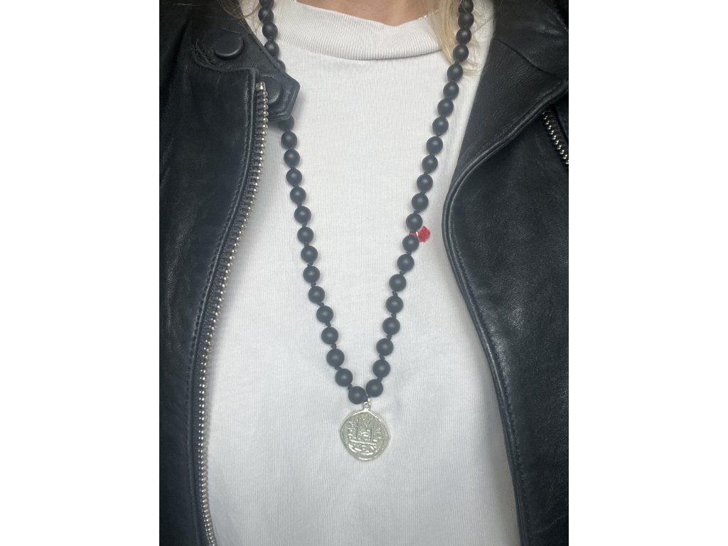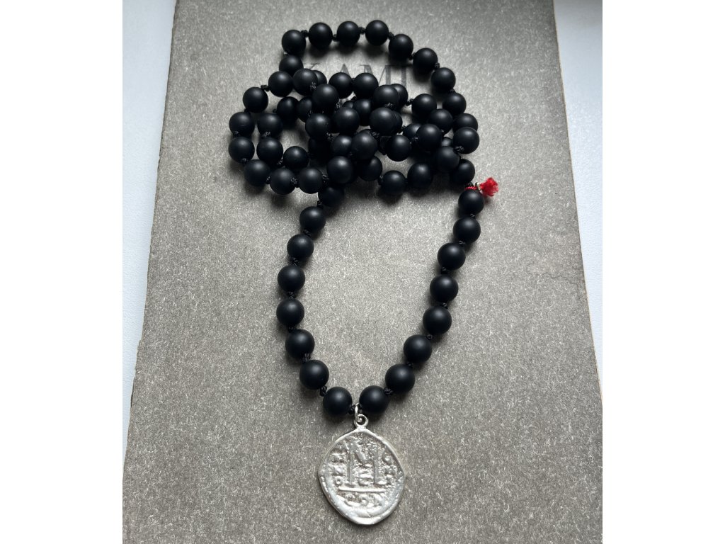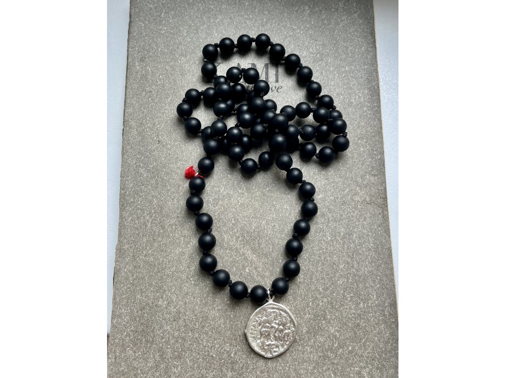 Ručně dělaný náhrdelník z matného černého onyxu se stříbrným medailonem (Ag925) a střapečkem z hedvábné šňůrky, návlek přes hlavu.
