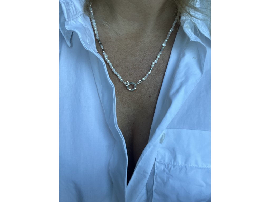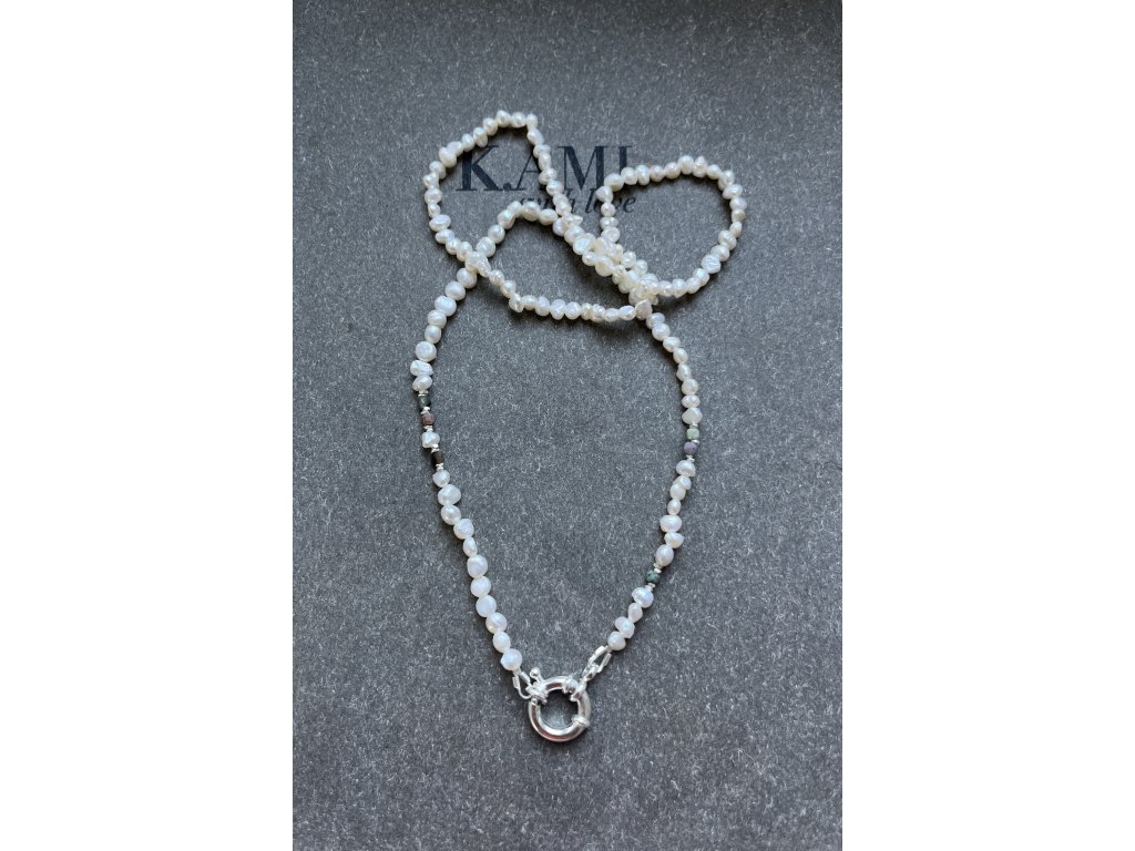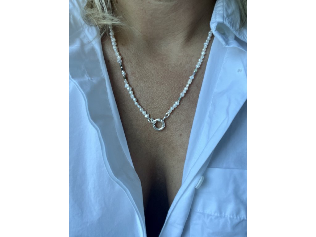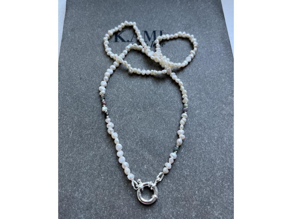 Krásný elegantní náhrdelník z perliček se stříbrnými fazetami, kamínky (turmalíny) a stříbrným zdobným zapínáním (Ag925).