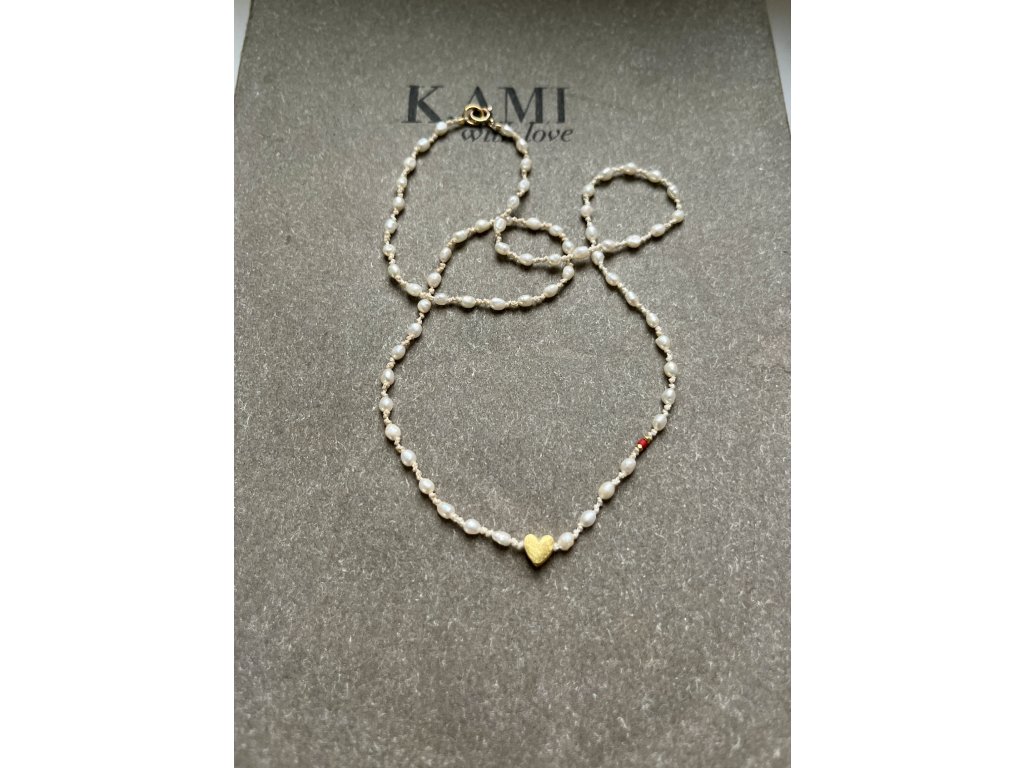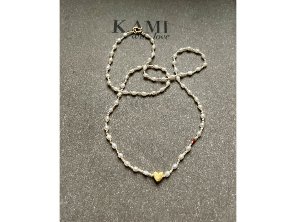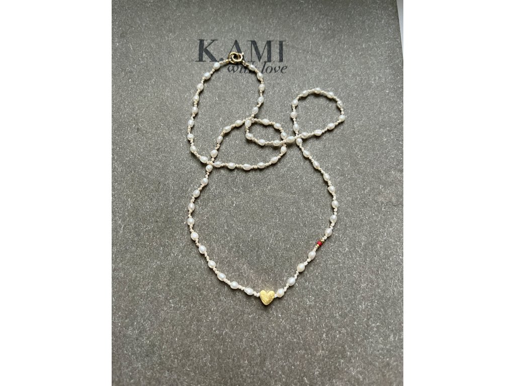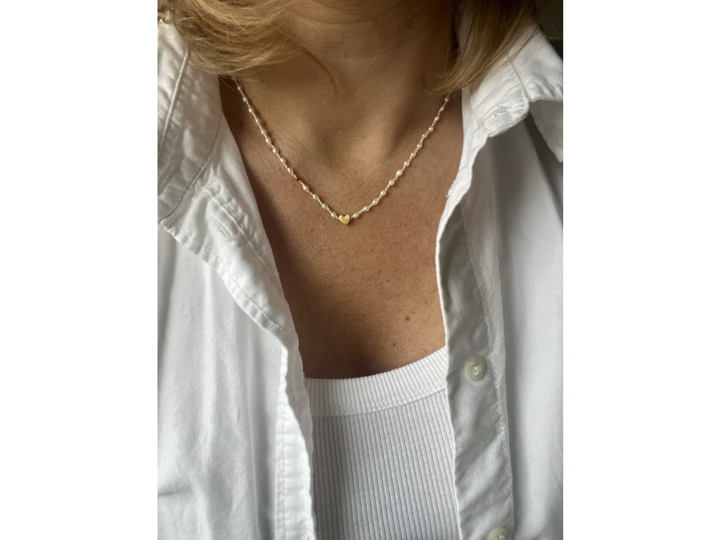 Ručně dělaný náhrdelník z říčních perliček se zlacenými fazetami, japonském rokajlem a česaným zlaceným srdíčkem (Ag925), zlacené zapínání (Ag925).