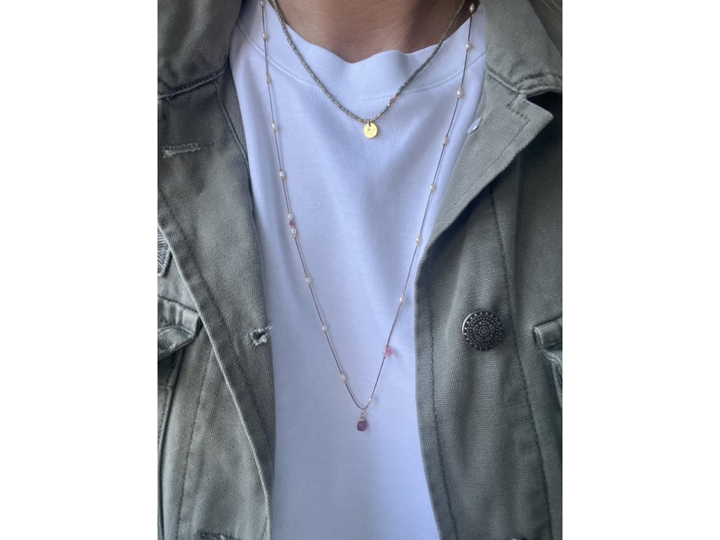 Dlouhý jemný náhrdelník z říčních perliček a zlacených fazet s turmalínem (Ag925), návlek přes hlavu.