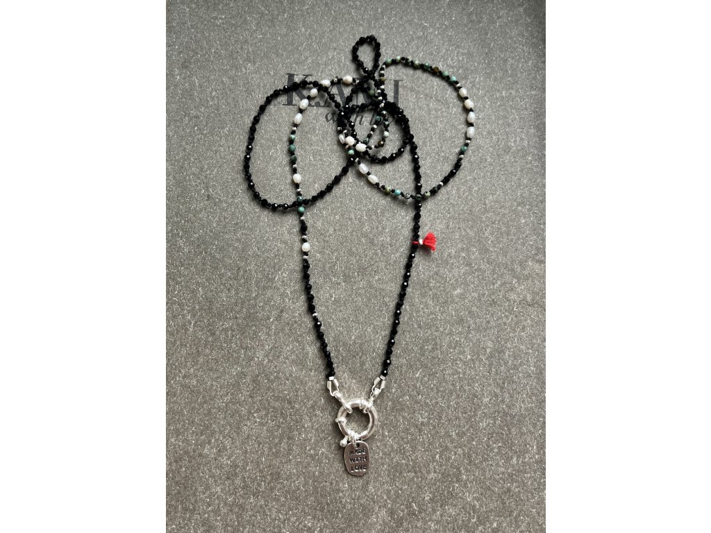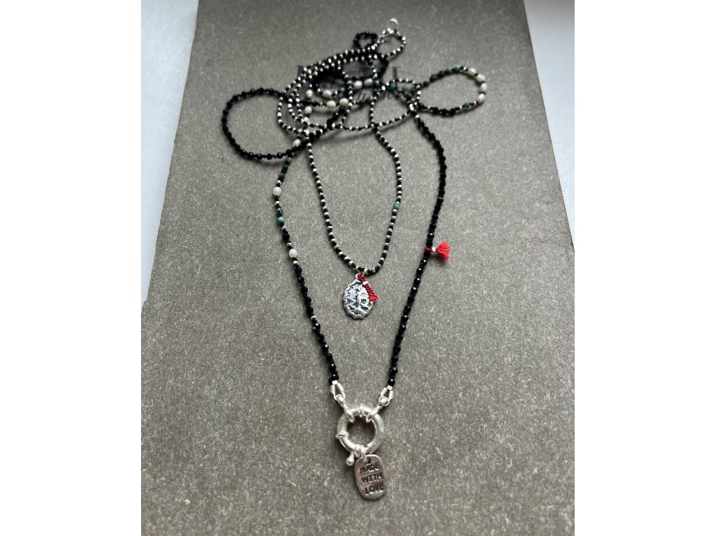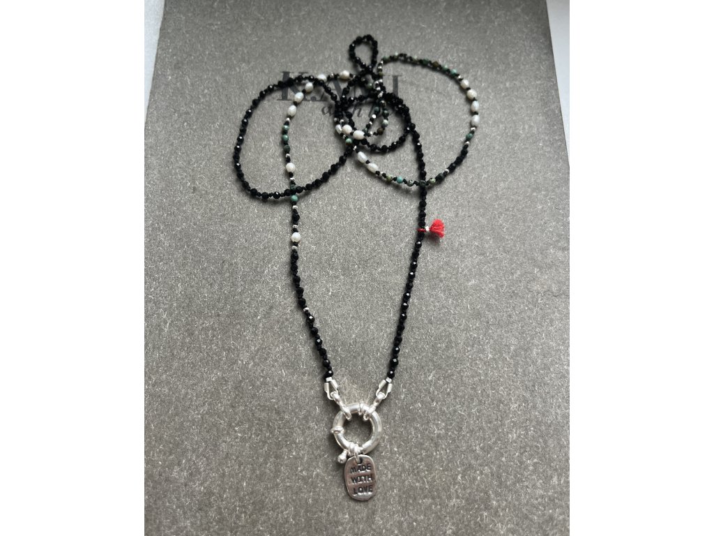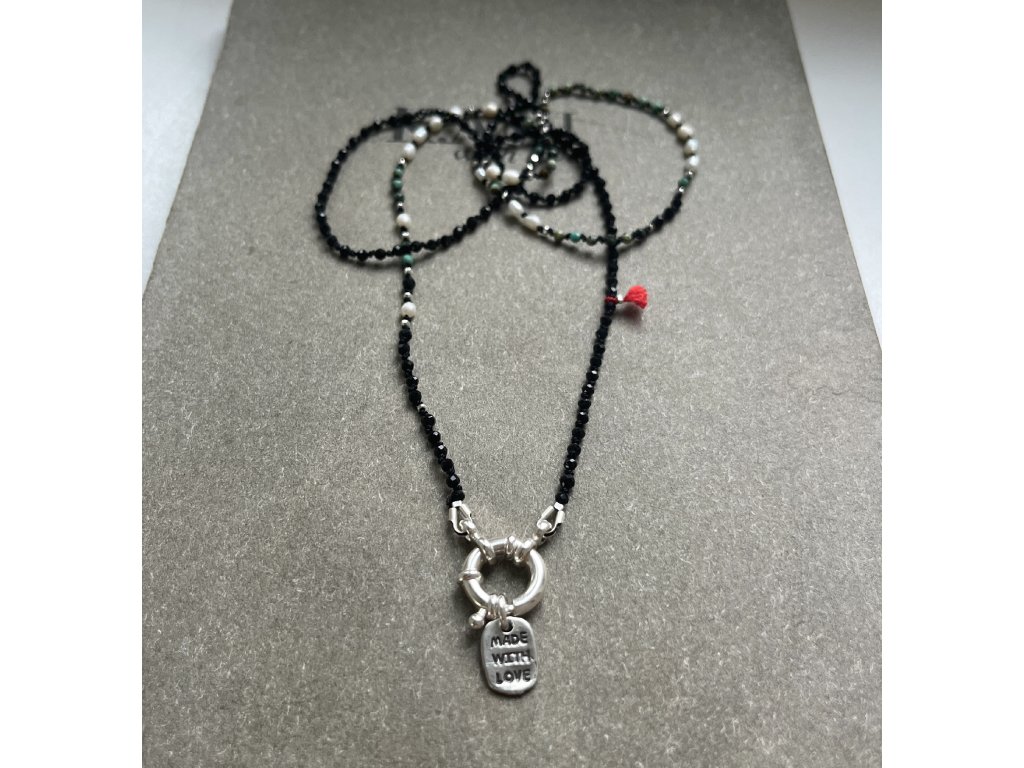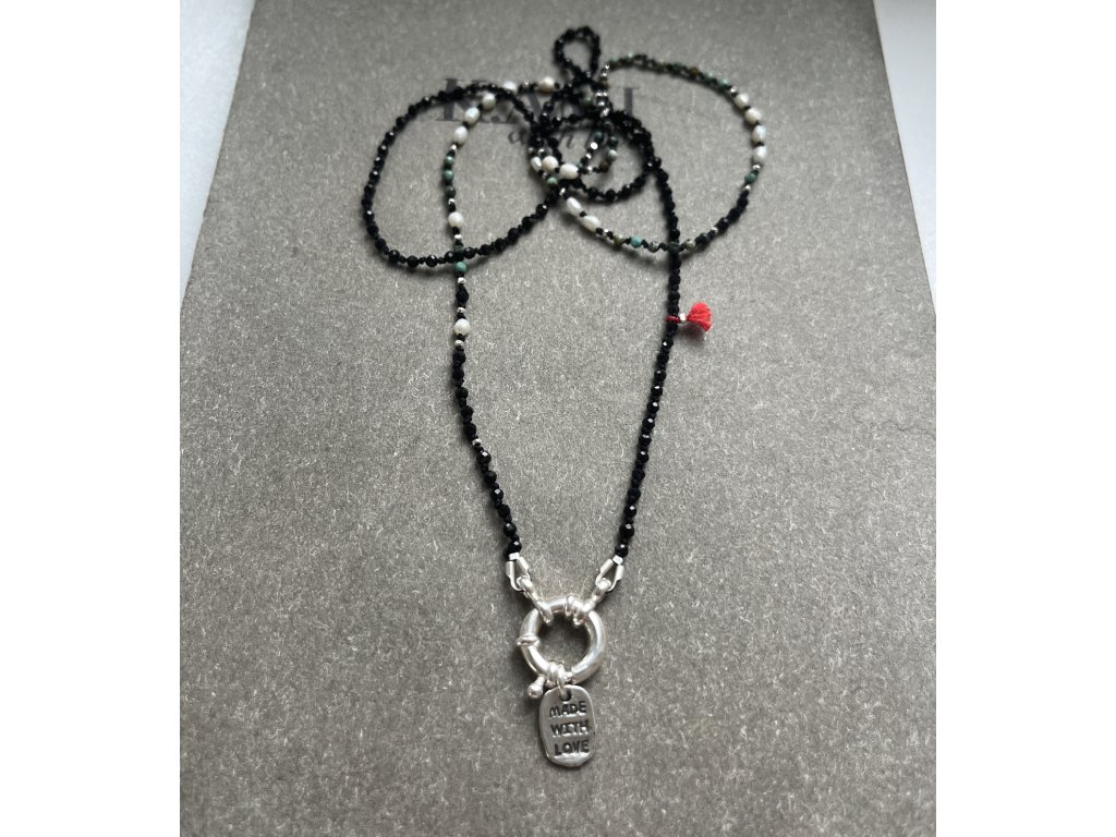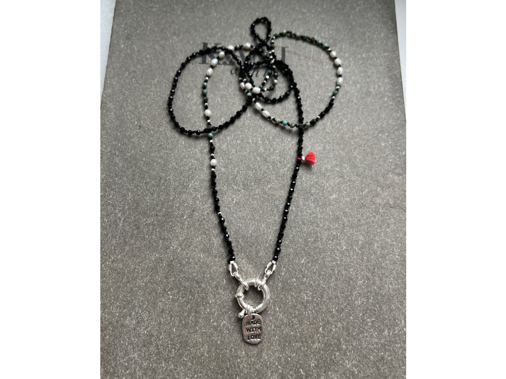 Dlouhý ručně dělaný náhrdelník z černého turmalínu, afrického tyrkysu a říčních perliček se stříbrnými fazetami (Ag925), stříbrným zdobným zapínáním a přívěskem Made With Love (Ag925).