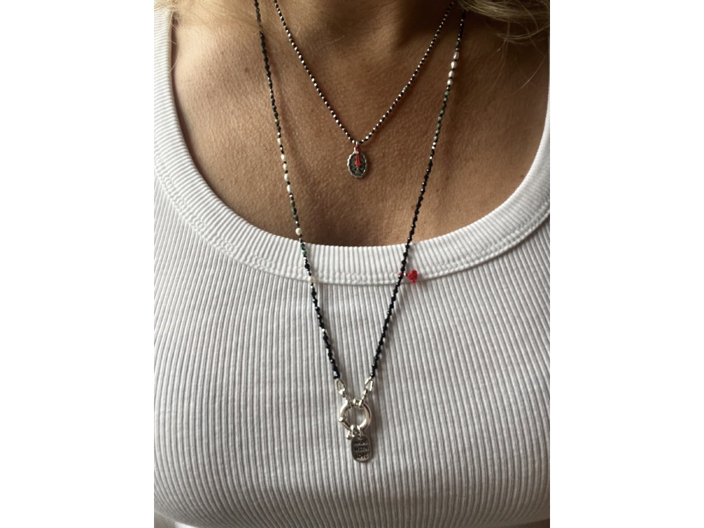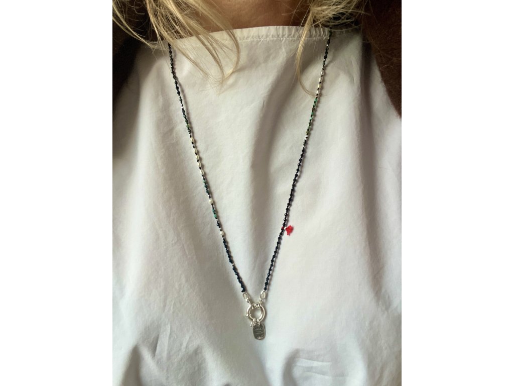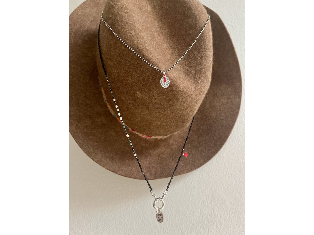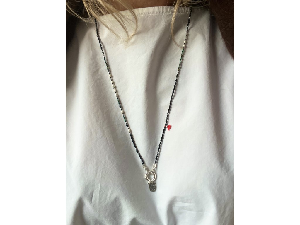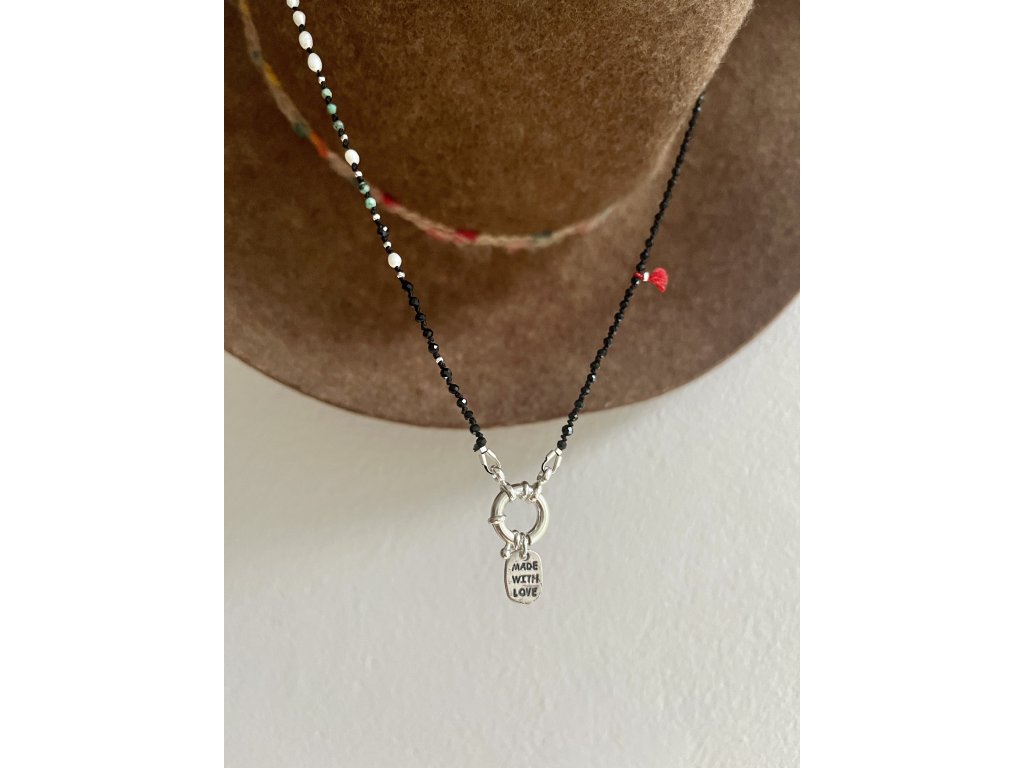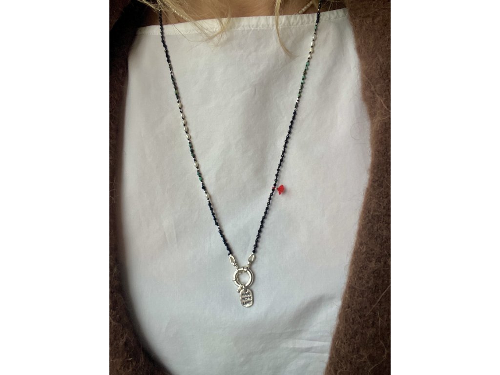 Dlouhý ručně dělaný náhrdelník z černého turmalínu, afrického tyrkysu a říčních perliček se stříbrnými fazetami (Ag925), stříbrným zdobným zapínáním a přívěskem Made With Love (Ag925).
