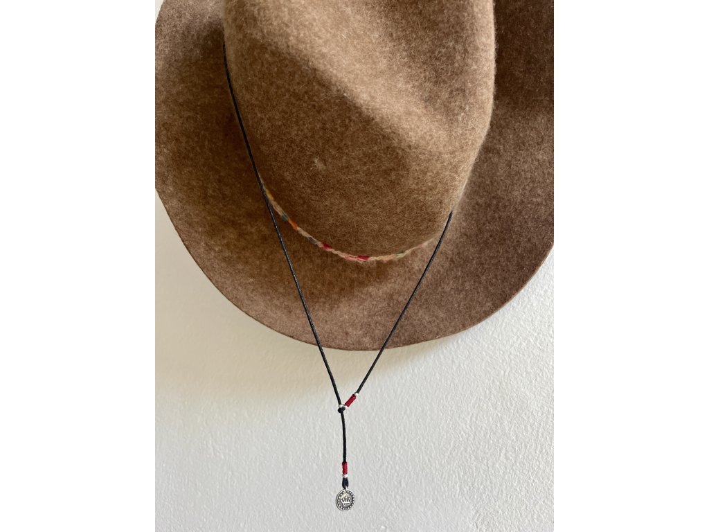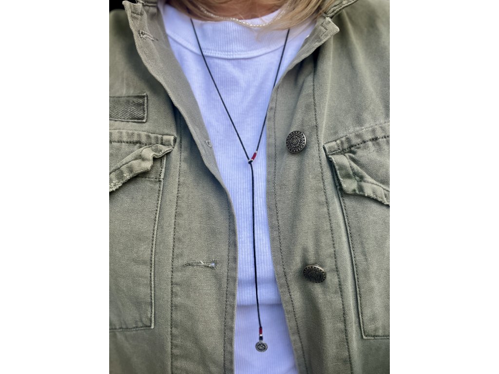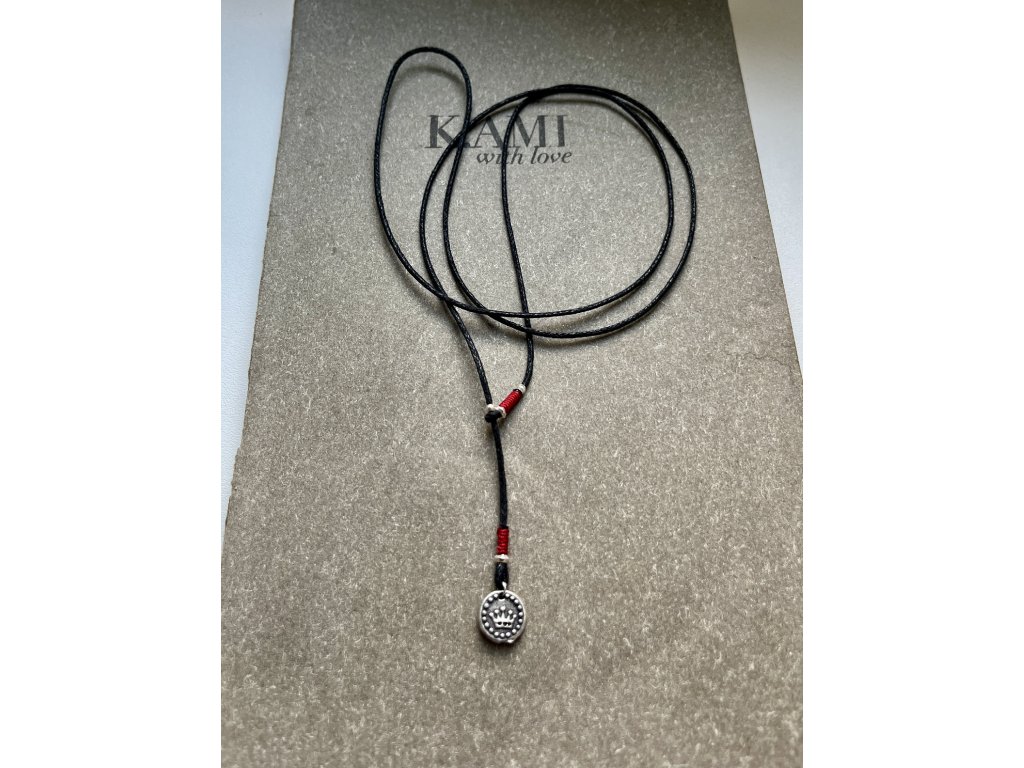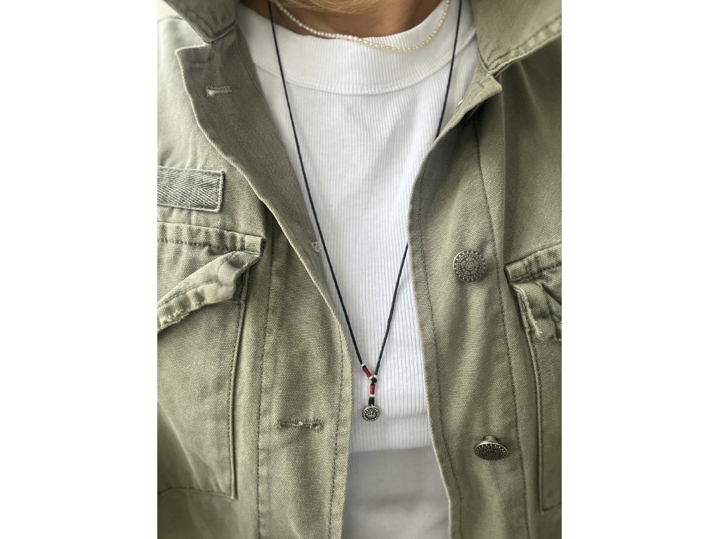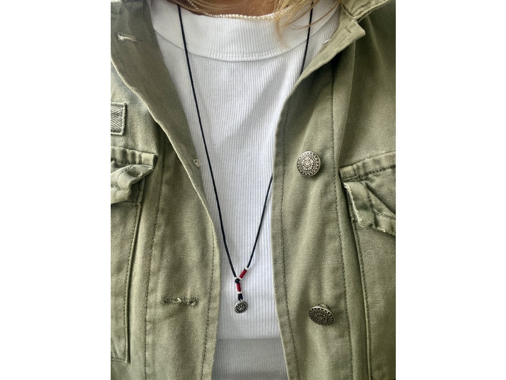Tloušťka bavlněné šňůrky 1 mm, odstín černá. Obvod náhrdelníku 70 cm. Náhrdelník lze libovolně posouvat a utahovat.