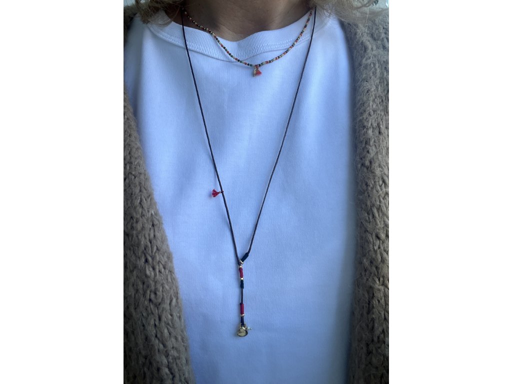 Tloušťka bavlněné šňůrky 1 mm, odstín hnědá. Obvod náhrdelníku 66 cm. Náhrdelník lze libovolně posouvat a utahovat.
