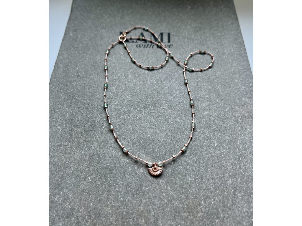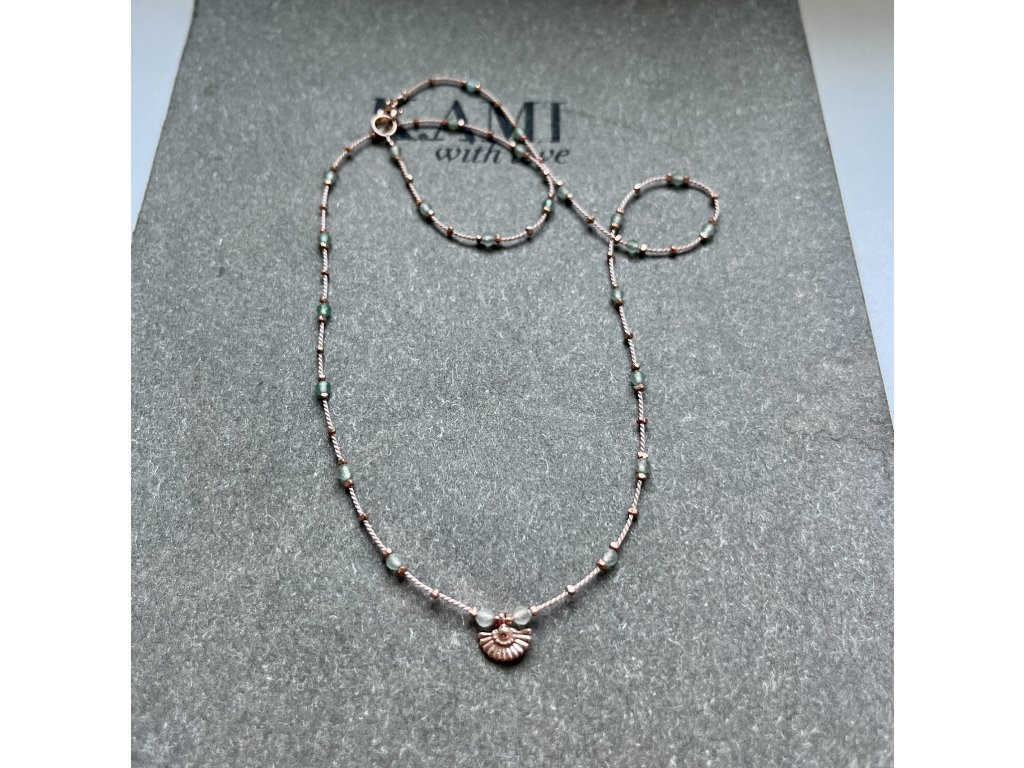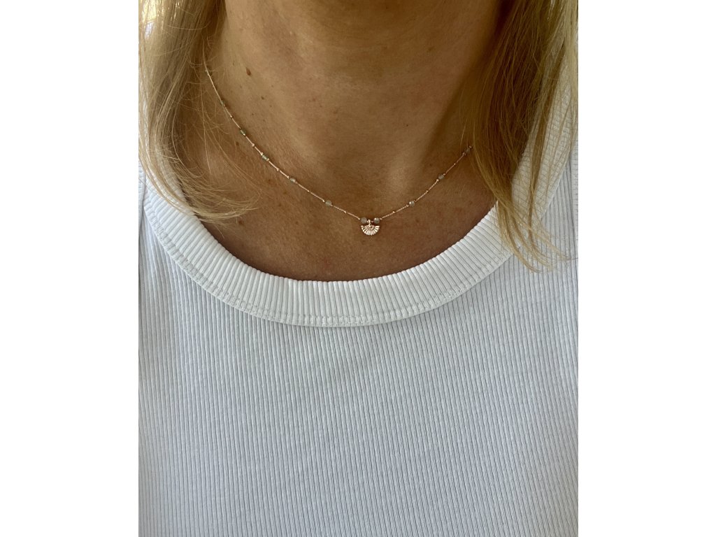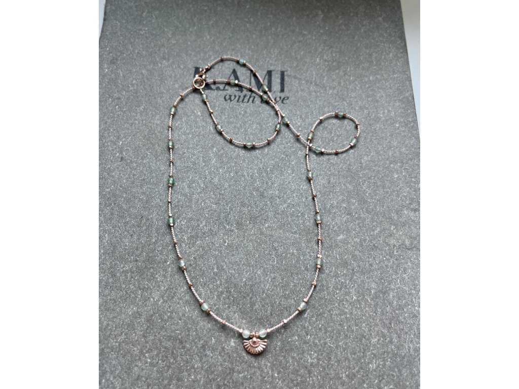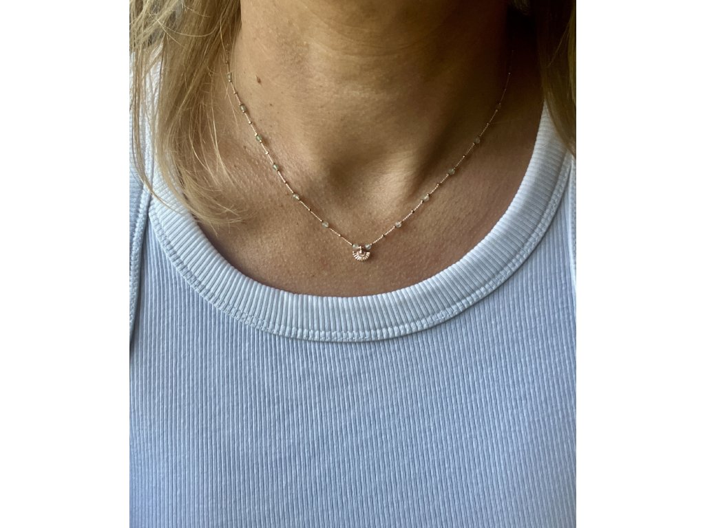 Velmi jemný řetízek z avanturínu a fazet zlacených růžovým zlatem (Ag925) s vějířkem (Ag925). Zlacené zapínání (Ag925).