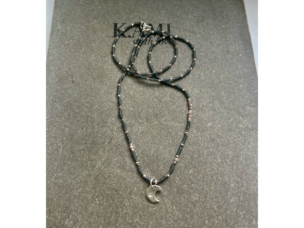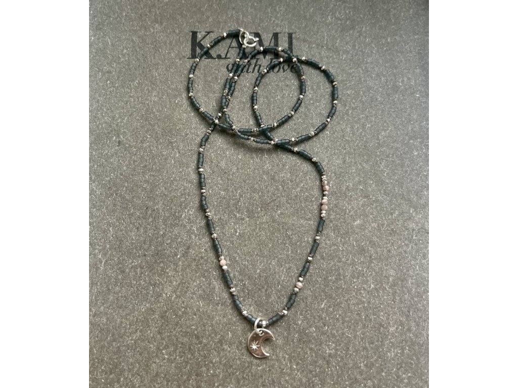 Ručně dělaný řetízek z japonských rokajlů, stříbrných fazet a rodochrozitu se stříbrným měsíčkem (Ag925) na šedé hedvábné šňůrce, stříbrné zapínání (Ag925).
