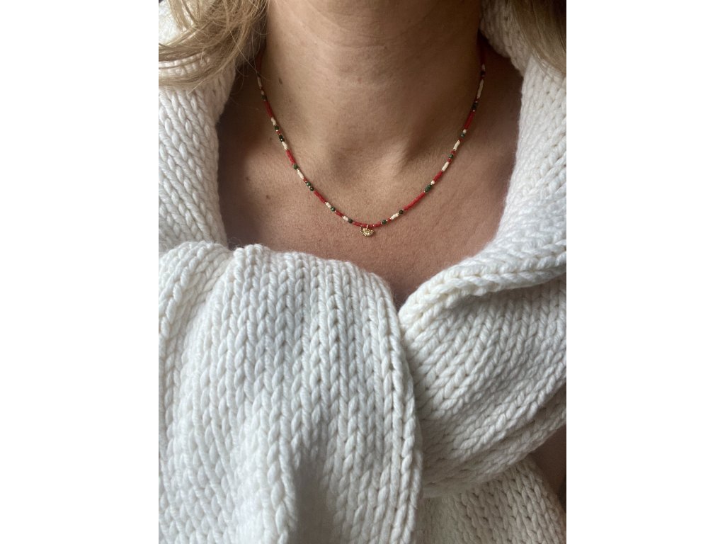 Krásný řetízek z japonských rokajlů se zlacenými fazetami, zlaceným vějířkem (Ag925) a malachity, zlacené zapínání (Ag925).
