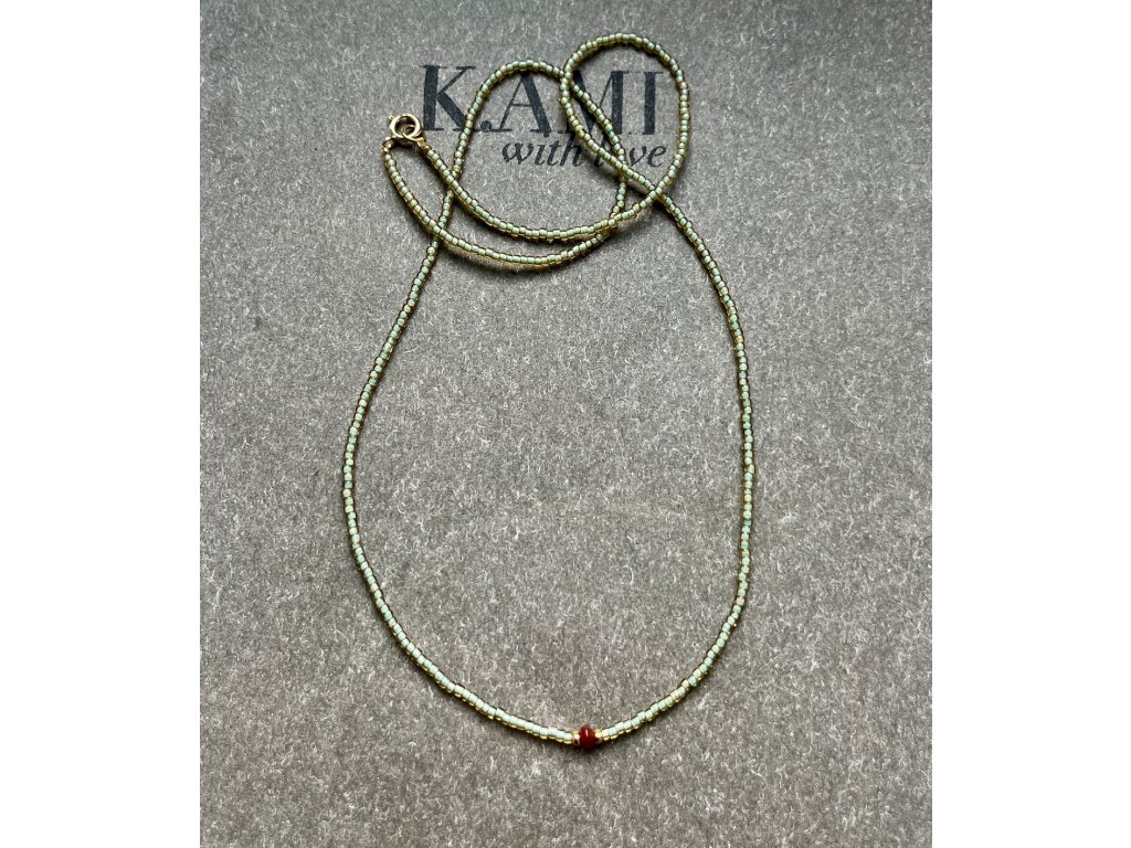 Řetízek z japonských rokajlů a zlacených korálků (Ag925) s mexickým opálem, zlacené zapínání (Ag925).
