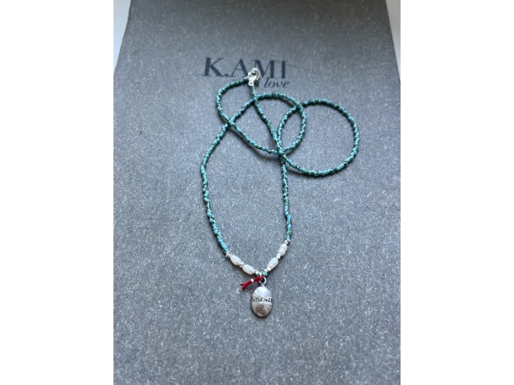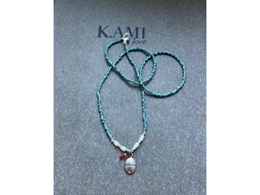 Řetízek z japonských rokajlů se stříbrnými fazetami, perličkami a stříbrným přívěskem Patience (laskavost), stříbrné zapínání (Ag925).