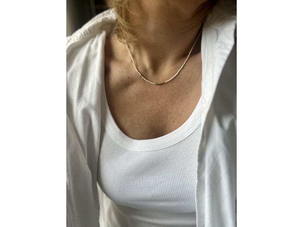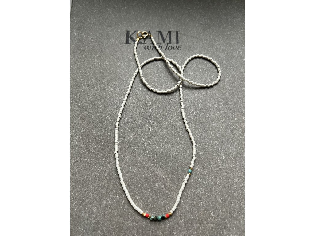 Ručně dělaný řetízek z japonských rokajlů a zlacených fazet (Ag925) se zlaceným kompasem (Ag925) a kamínkem, zlacené zapínání (Ag925). Obvod řetízku cca 47 cm.