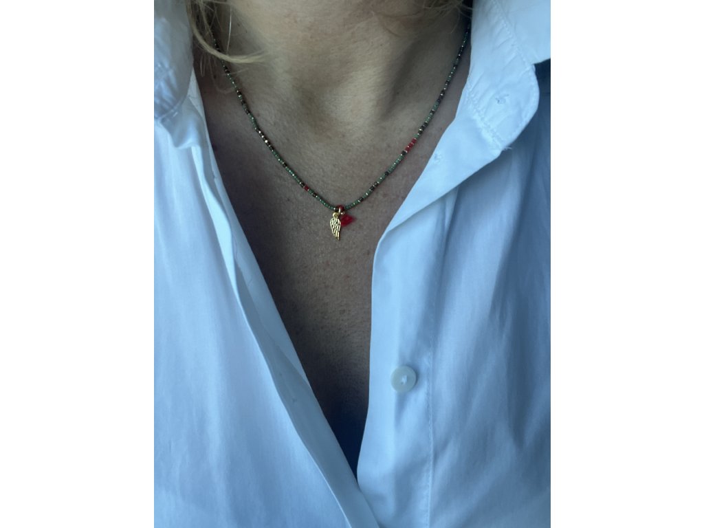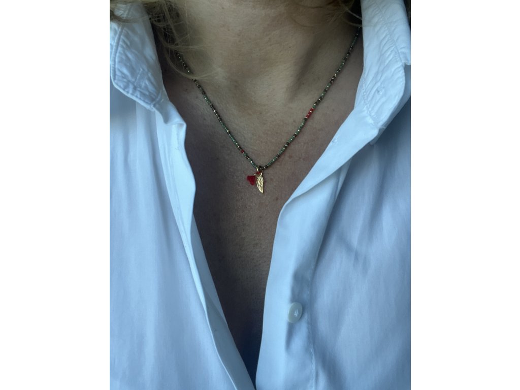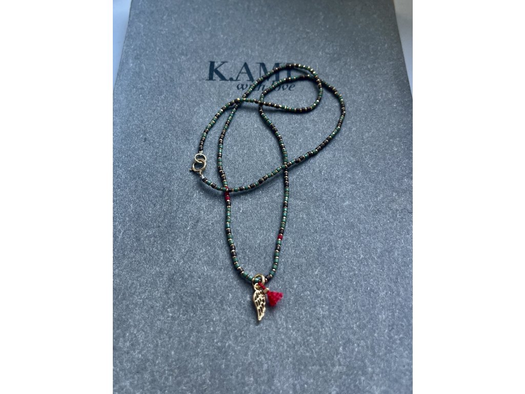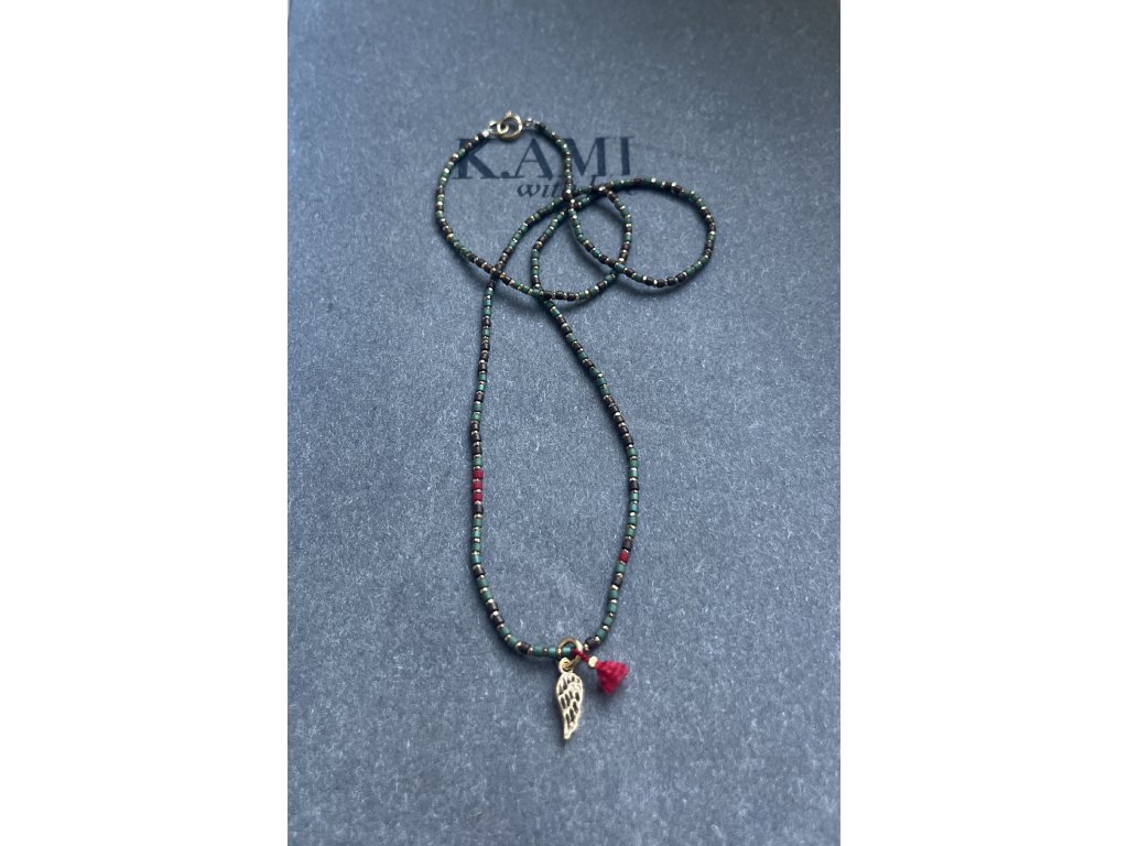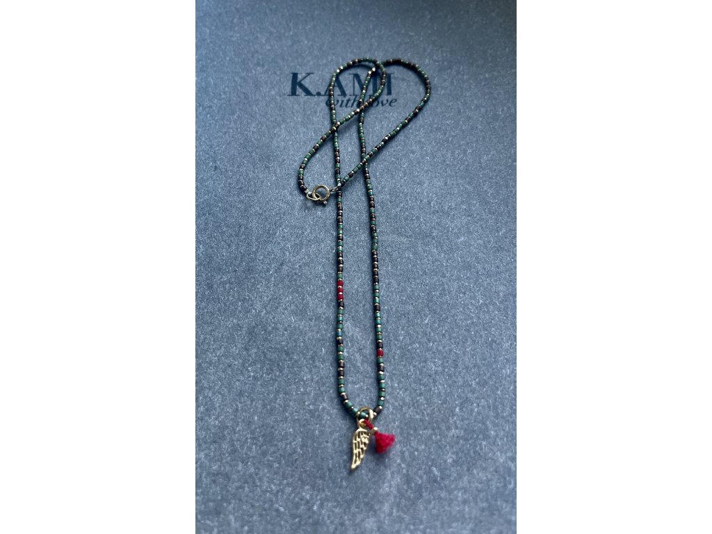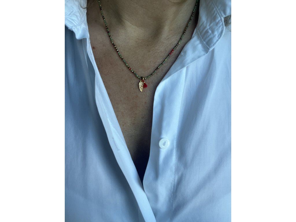 Řetízek z japonských rokajlů se zlacenými fazetami, zlaceným andělským křídlem a střapečkem z hedvábné šňůrky se zlacenou fazetou (Ag925), zlacené zapínání (Ag925).